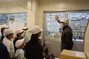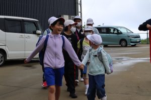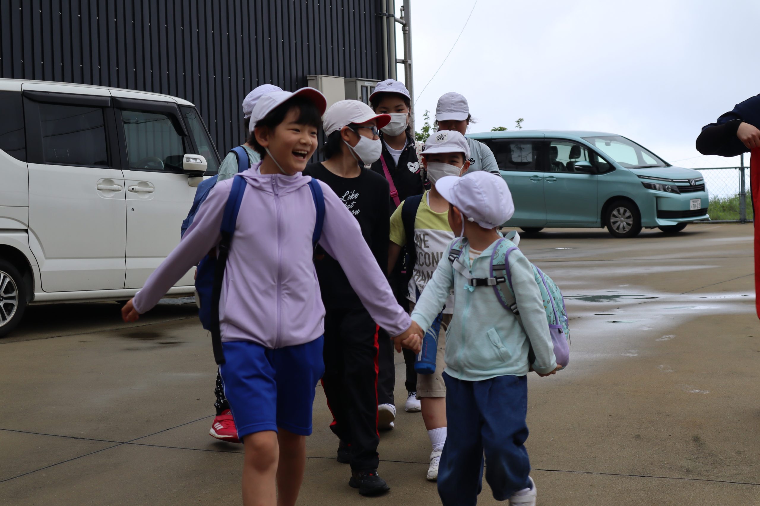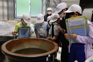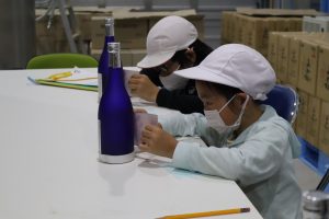 前期課程が片泊地区から隣の大里地区まで歩く「1日遠足」。 今年は残念ながら雨だったので、中間地点からてくてく歩きました。 「三島村」や「メンドン」の焼酎を造っている「みしま焼酎 無垢の蔵」さんの見学もさせていただきました。 自分たちが飲んだことはないものの、島を越えて愛されている焼酎がどのように造られているのか、詳しく教えていただきました。商品ラベルを貼る体験もさせてもらい、前期課程にとっては、初めてのプチ職業体験でしたね。