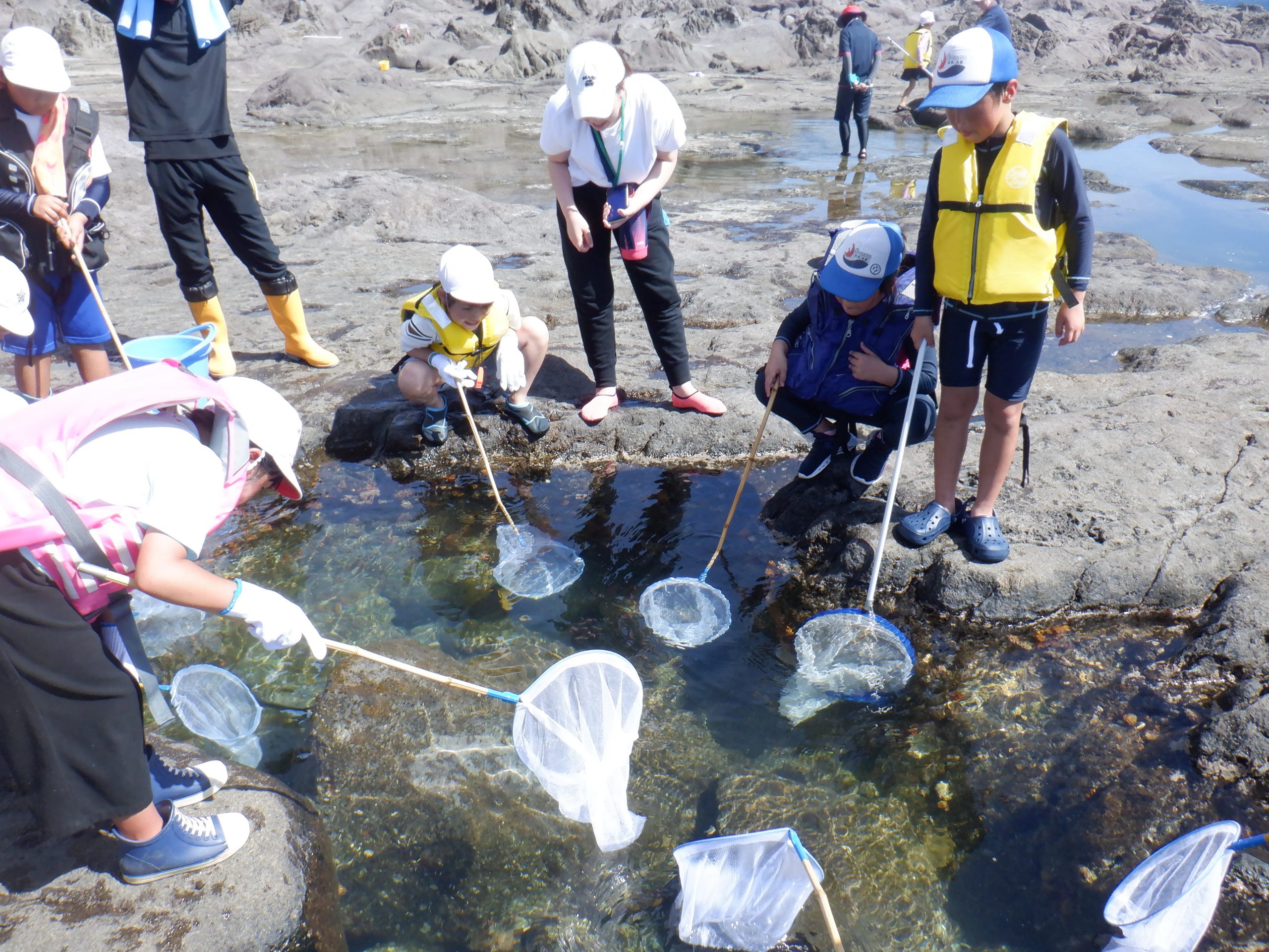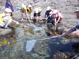 午後からは片泊港近くの磯で磯遊びを行いました。潮だまりで小さな魚やヤドカリを捕まえて楽しみました。