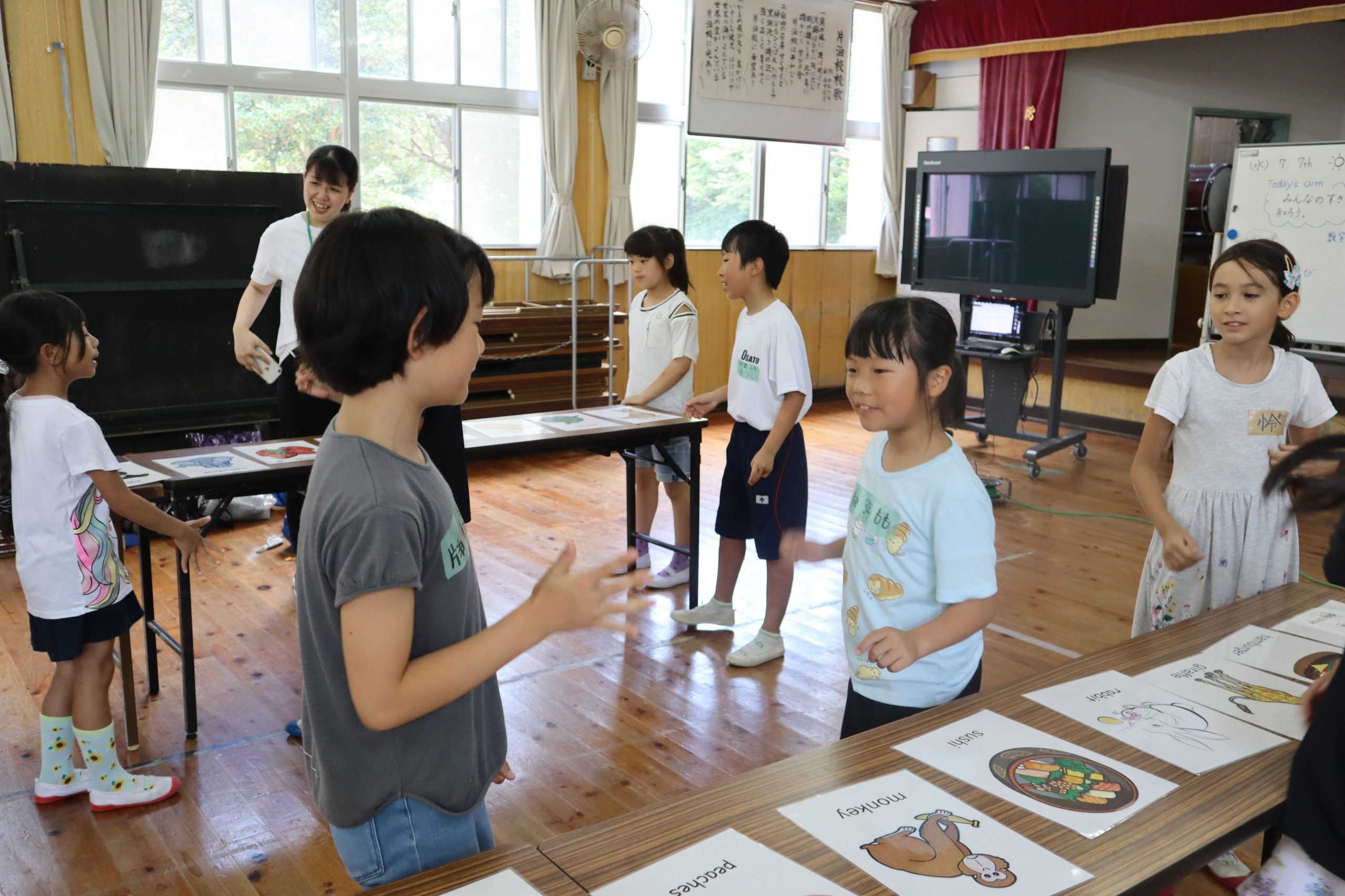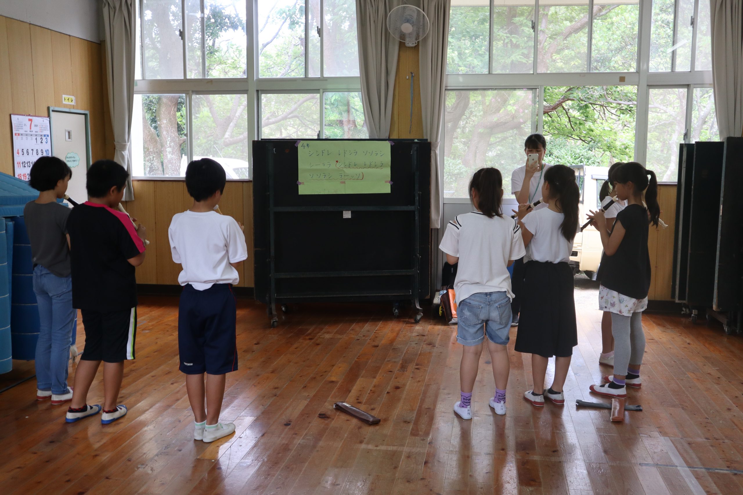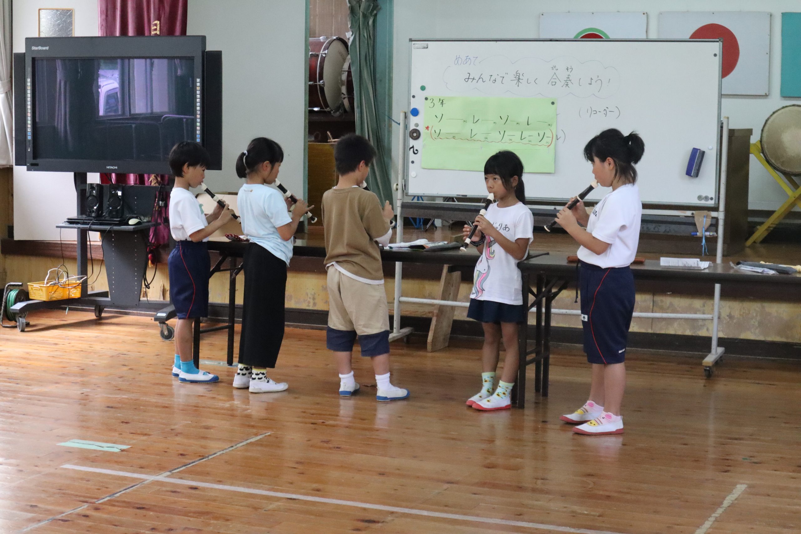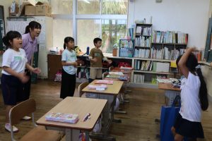 1時間目は自己紹介をかねたレクリエーション,2時間目は合同で英語活動,3時間目は3,4年別々で国語,4時間目はみんなで音楽を楽しく学習しました。