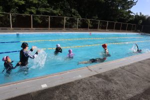 学校に戻ってお別れの式を行ったあとも,まだ遊び足りなかったようで,みんなでプールで遊びました。