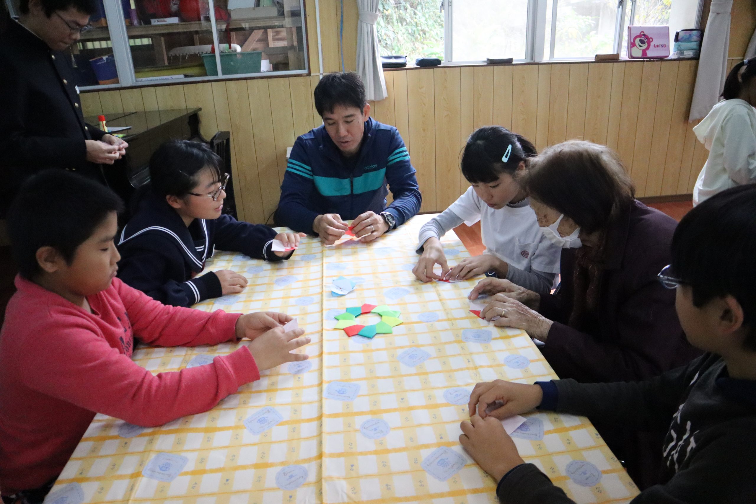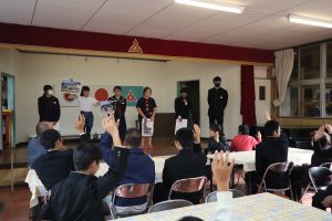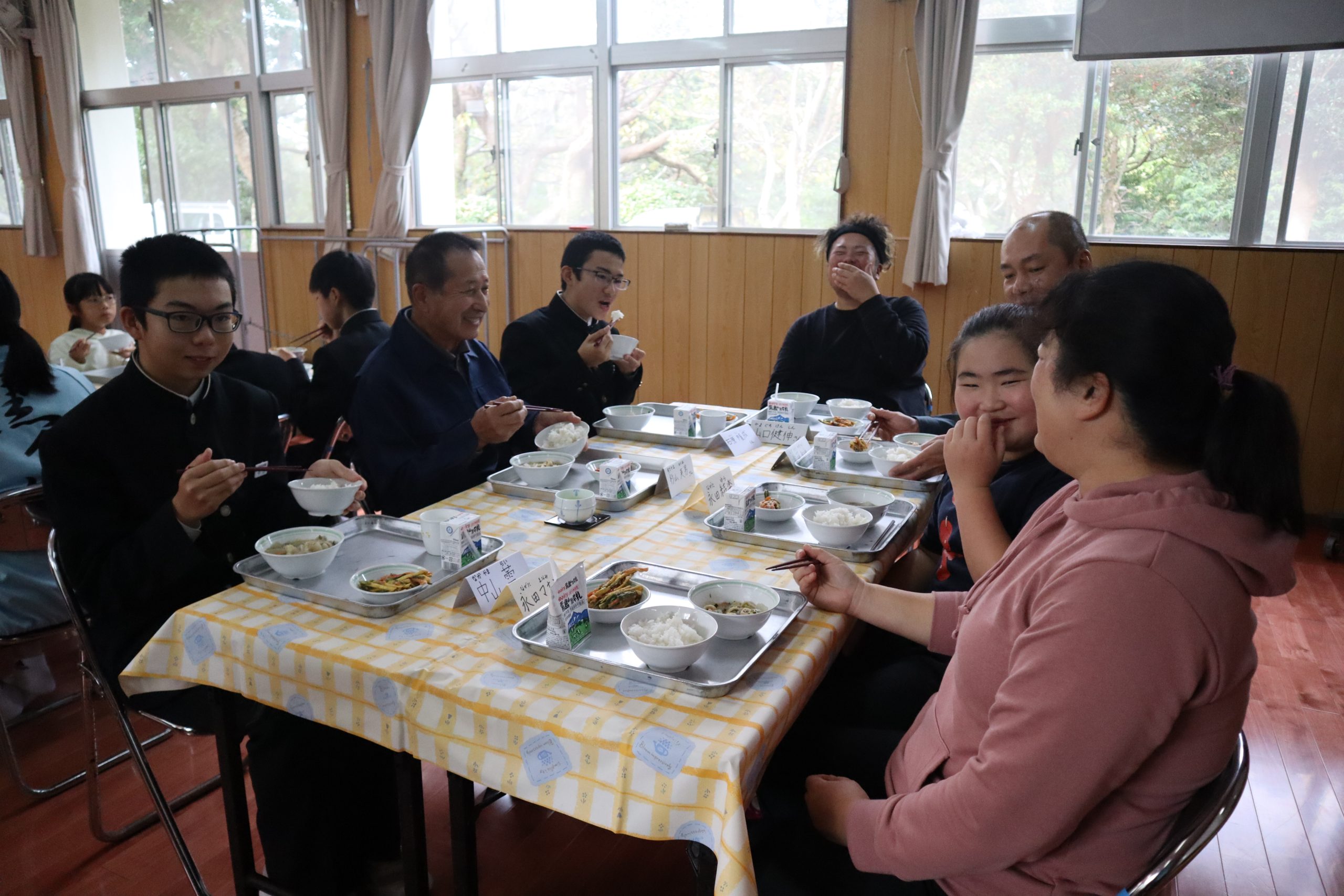 地域の高齢者の方を招待して,いも会食が行われました。給食では,片泊学園のみんなで育てたサツマイモを材料にした「ガネ」をいただきました。会食では「クイズ」「キャンディーしりとり」「クリマスリース作り」などのレクリェーションも行われ,大いに盛り上がりました。みんな,おかわりをたくさんしてくれて,完食でした。