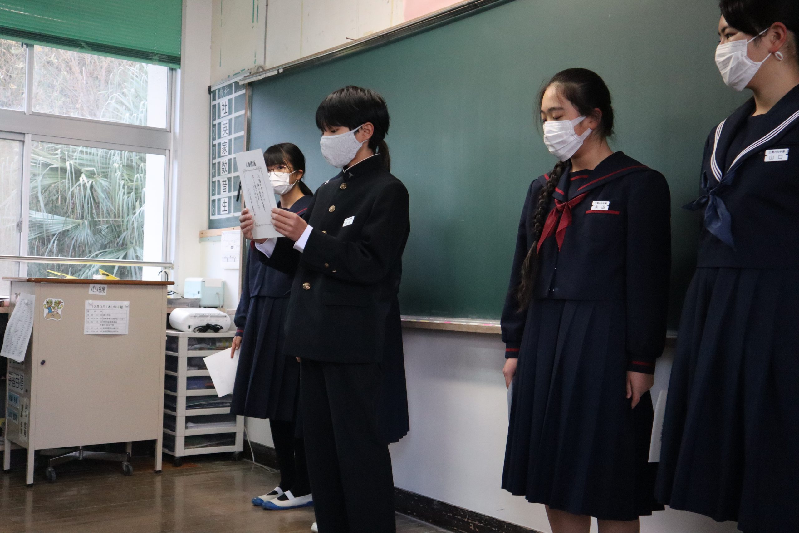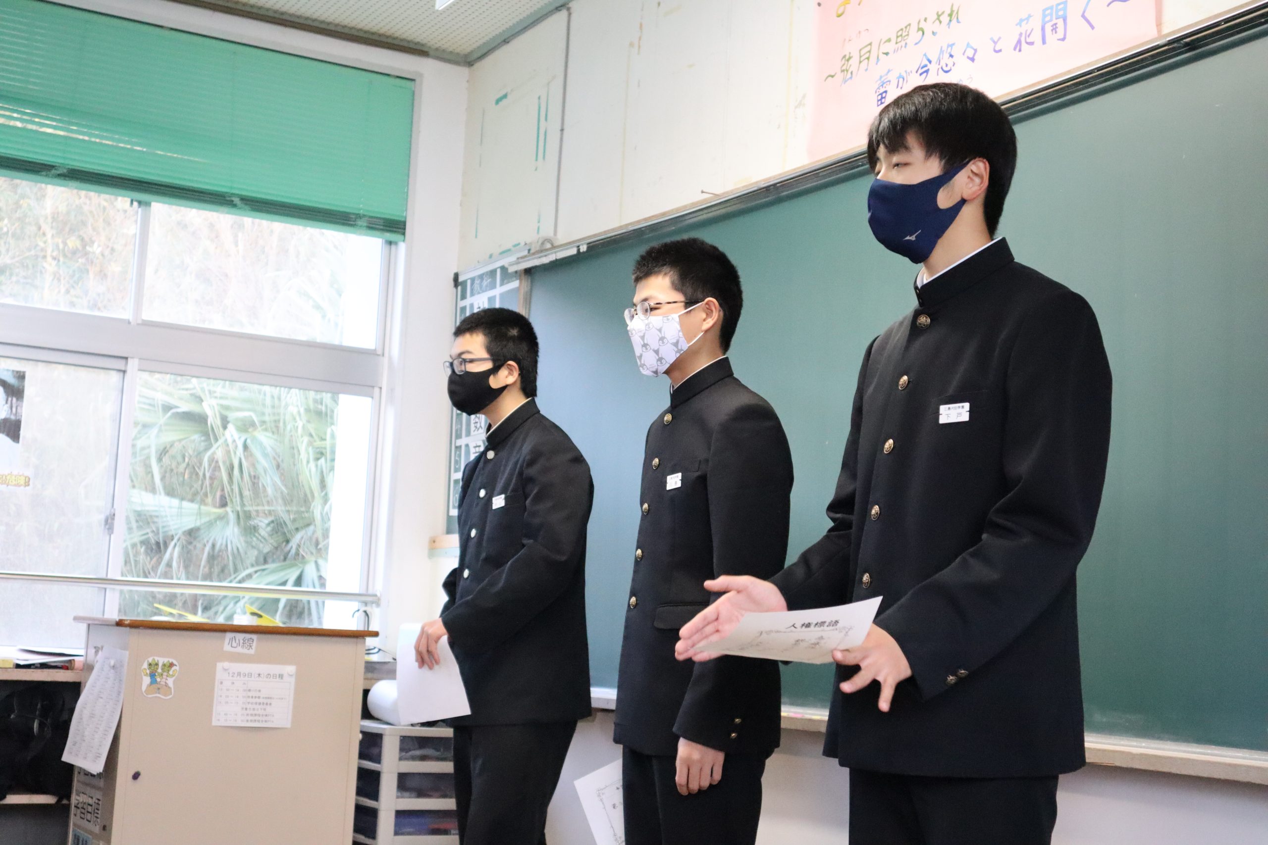 今朝の小中別朝会は,先週の学校人権週間の期間に作成した人権標語の発表を行いました。 1人1人どのような思いで標語を作成したのか発表をしていました。そして聞いている子どもたちも 真剣に聞いていました。人権週間は終わりましたが,これからも,「誰か」のことではなく「自分のこと」 として考えていってほしいと思います。
