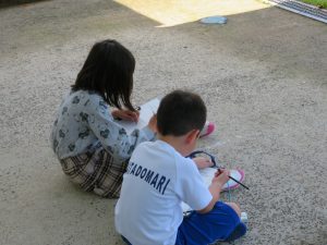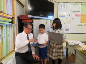 1・2年生は「学校探検」をしました。今日は校長先生に「おはなし」に行きたいとおもっていたのですが…。緊張した2人は職員室の前で「もじもじ」。 先生に促されて,やっと校長先生と「おはなし」することができました(*^_^*)