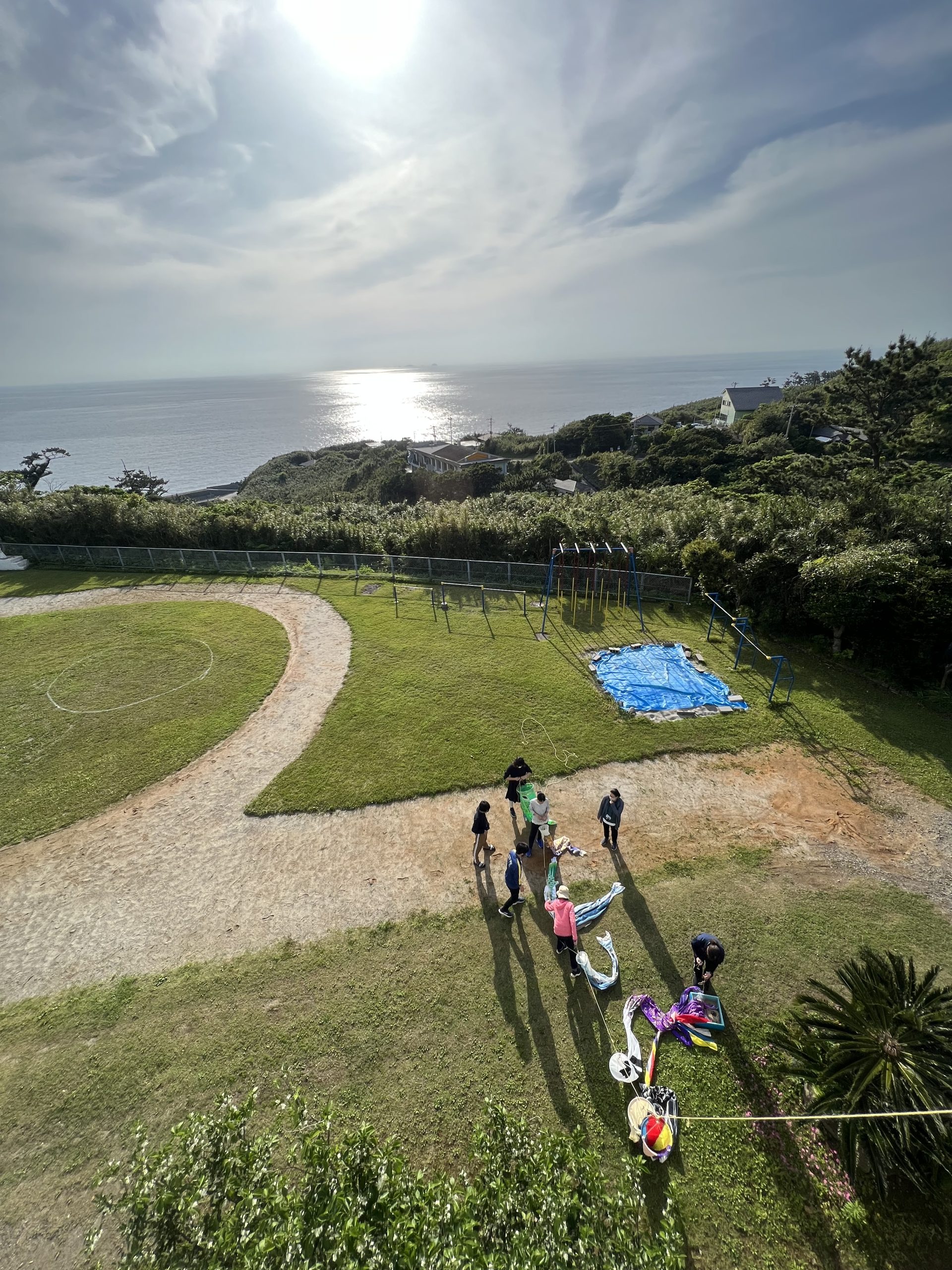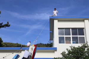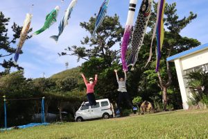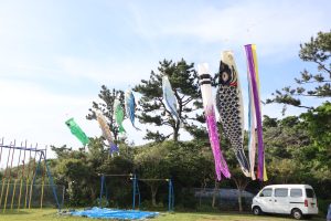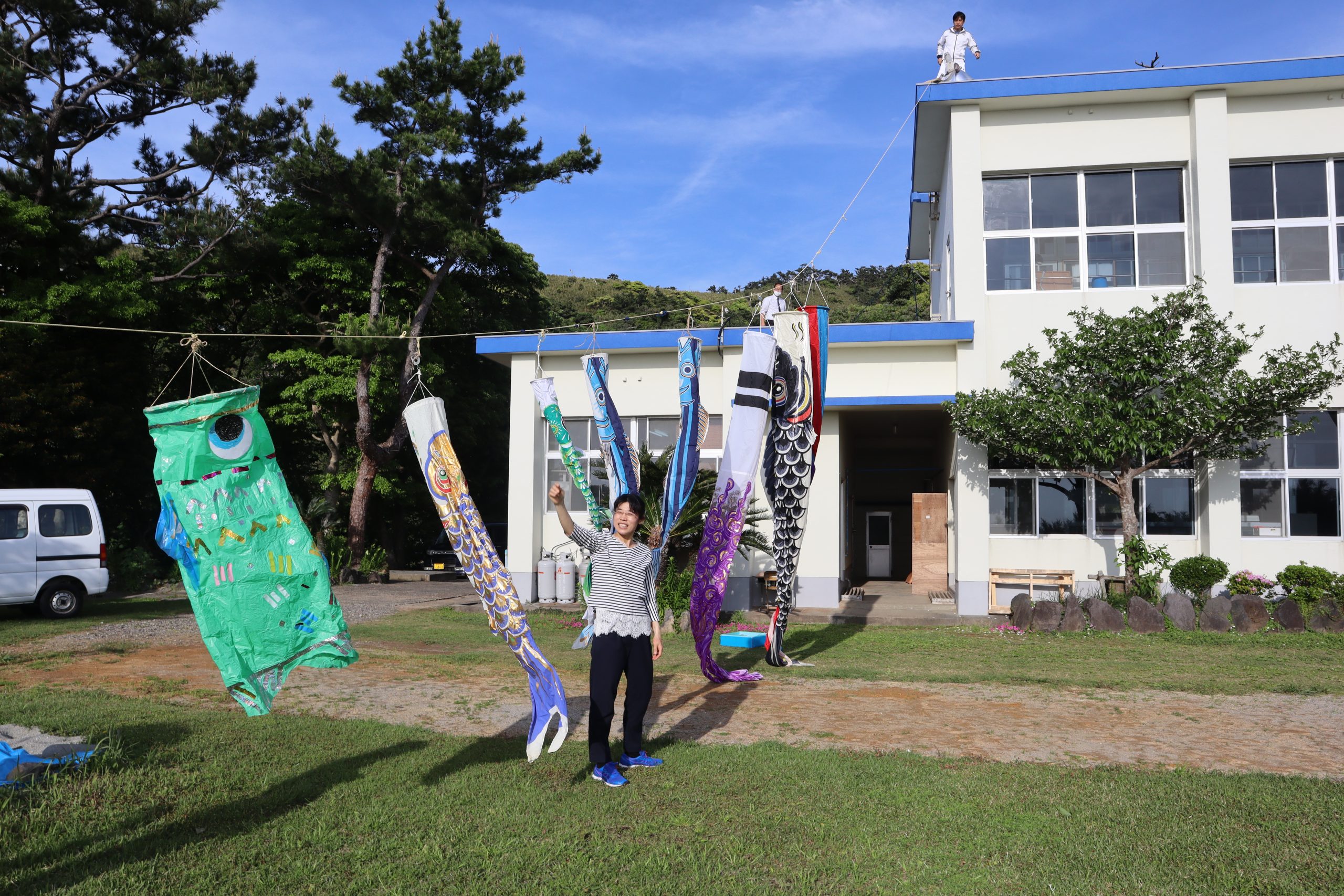 毎年恒例、学園の校庭に鯉(鰹)のぼりが設置されました。鰹のぼりは枕崎からいただいたもの。鯉のぼりは、地域の方に寄贈してもらったものです。来週の天気があまり良くない予報なので、本日お目見えとなりました。今日は爽やかな風を受けて、気持ちよさそうに泳いでいました。