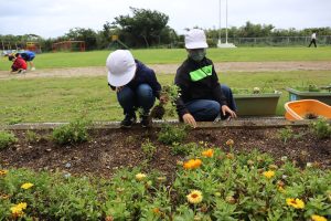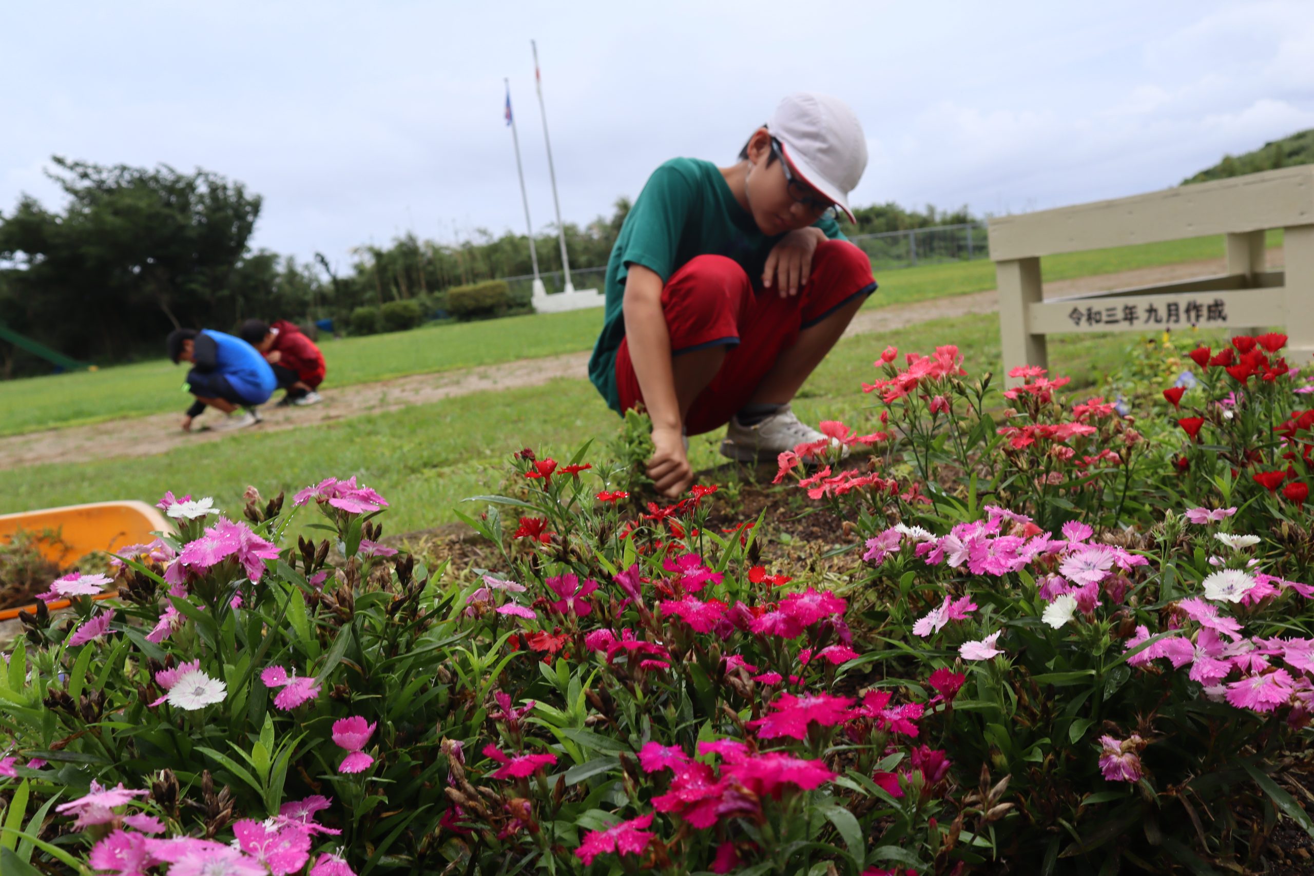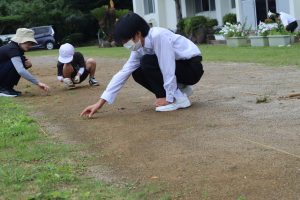 今日は、朝の活動の時間は雨が降っていなくて、花壇の手入れや校庭の草取りをしました。花壇は、まだきれいに咲いている花もありますが、枯れてきている花も。それを抜いたり、除草したりの作業をしました。校庭は最近の雨で地面が柔らかくなっていて、どんどん草取りをすすめることができました。