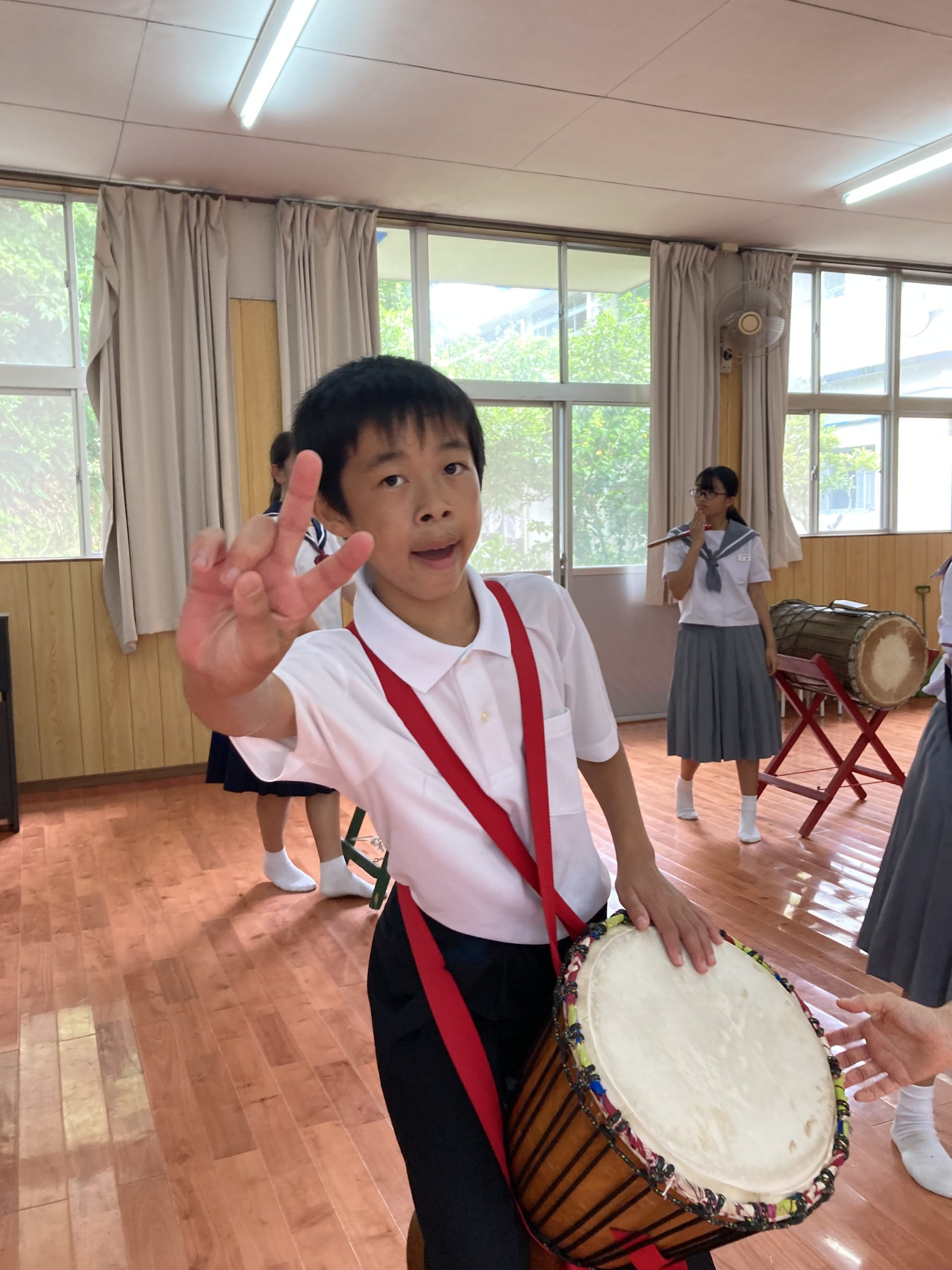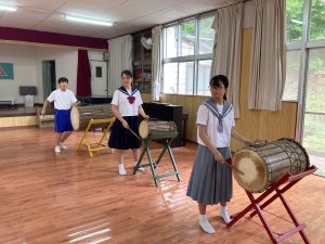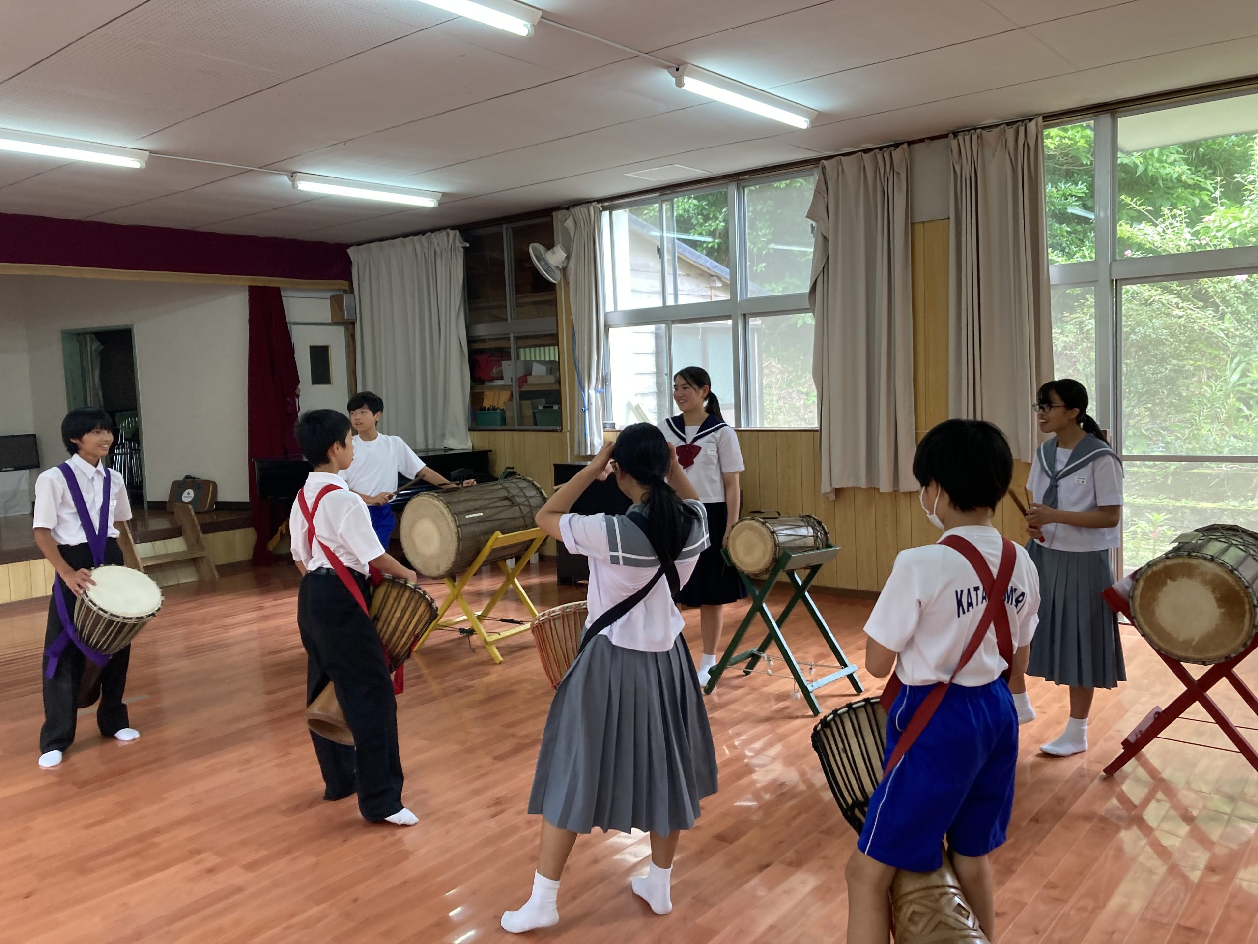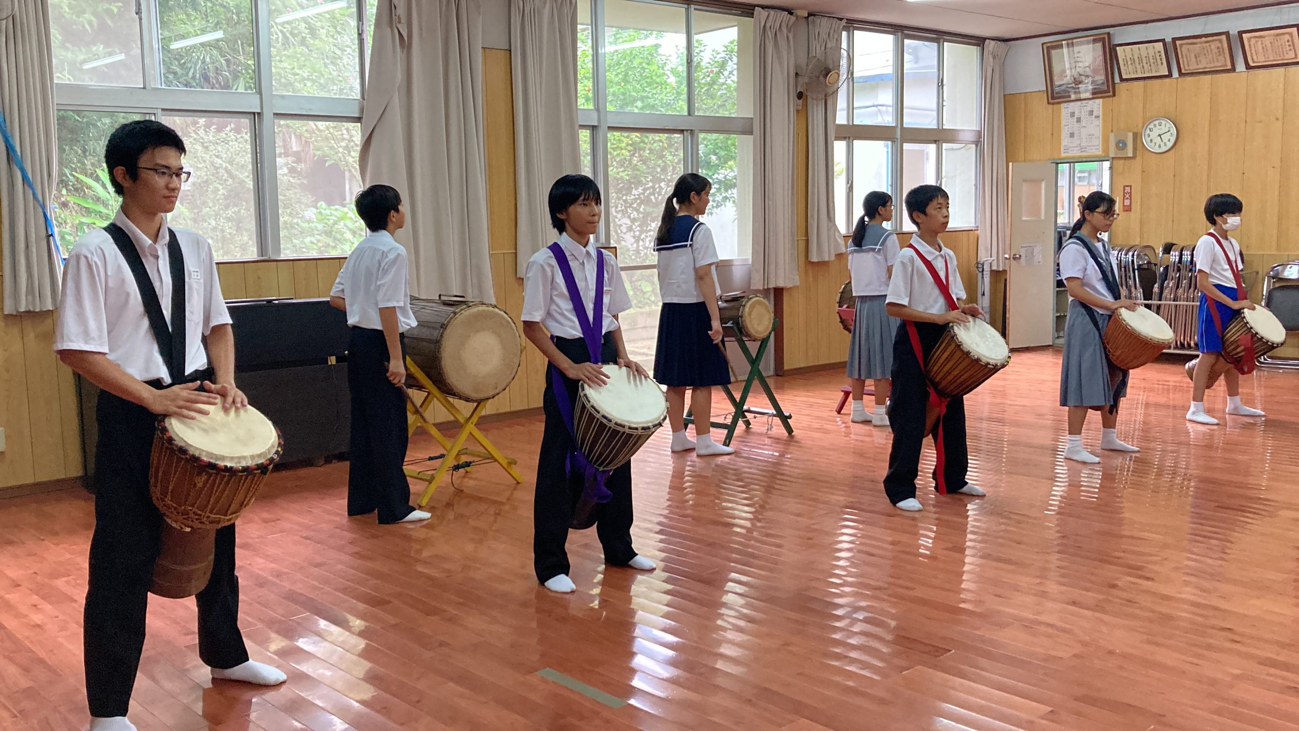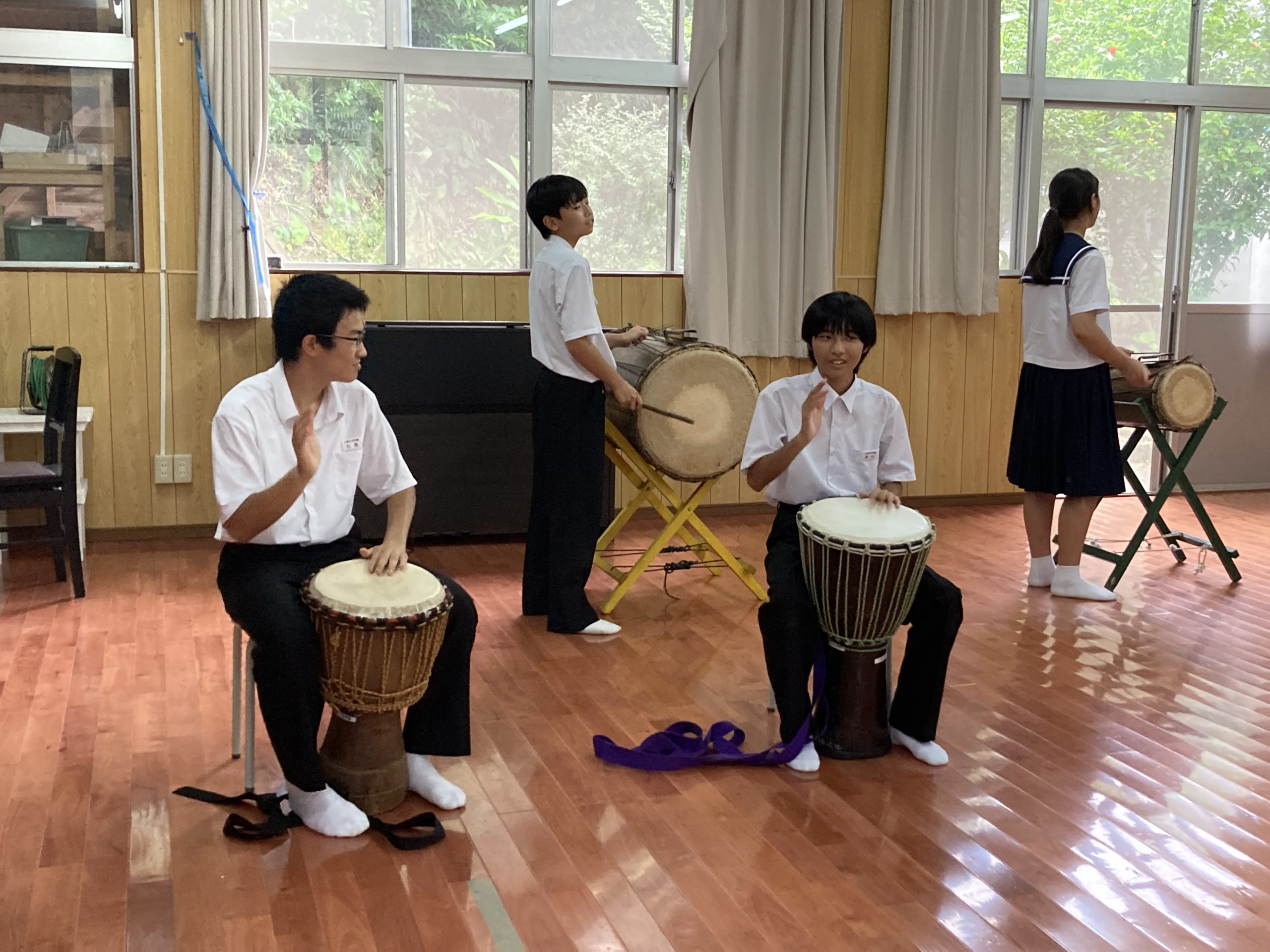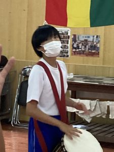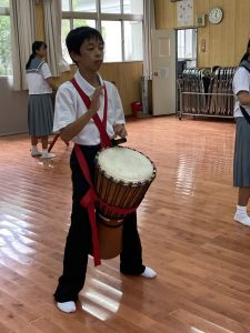7月22日の夏の祭典に向けて、ジャンベ練習にも力が入っています。今日は、放課後に練習の成果を先生方に見てもらいました。みんな楽しそうに演奏していました。本番も全力を出し切って会場にいる観客に感動を与えてほしいと思います。