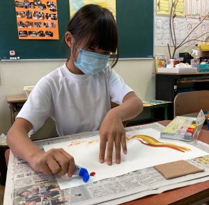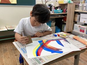本日は、1・2年生が図工で「えのぐひっぱレインボー」という題材で絵の具と段ボールの切れ端を使って紙いっぱいに描いていました。