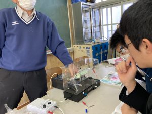 理科室で8年生は「電流は流れる理由は?」という謎を解いています。