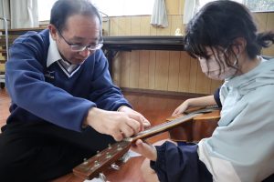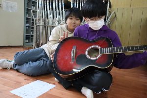 最後は、放課後子どもプランの音楽教室です。音楽教室は今日が今年度最後の活動でした。みんなでギターを練習して、創作曲「片泊のパレット」を歌いました。