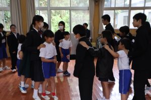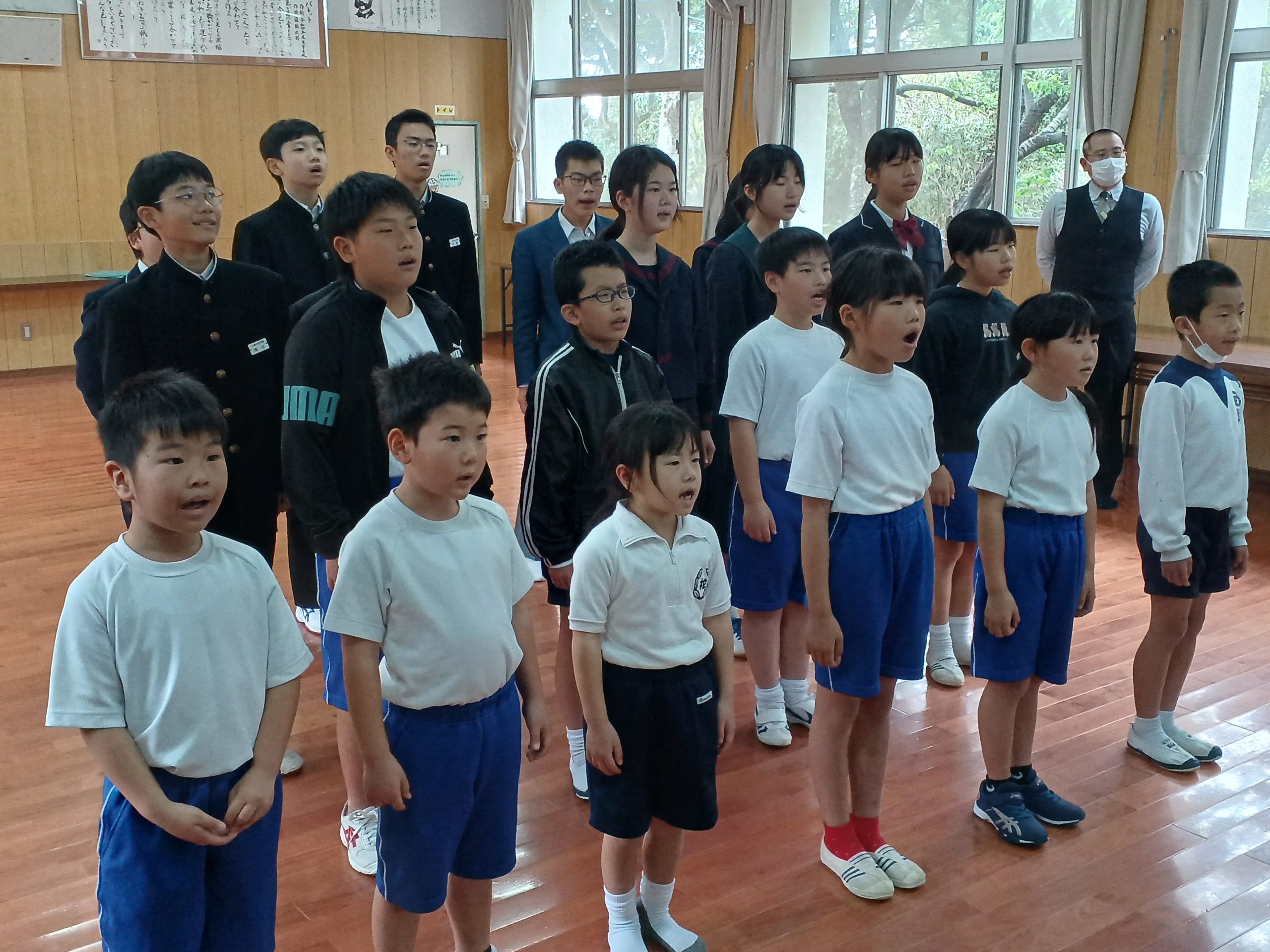 そして、3校時は1年生から9年生まで全員で音楽を行いました。はじめは、緊張していた子どもたちも