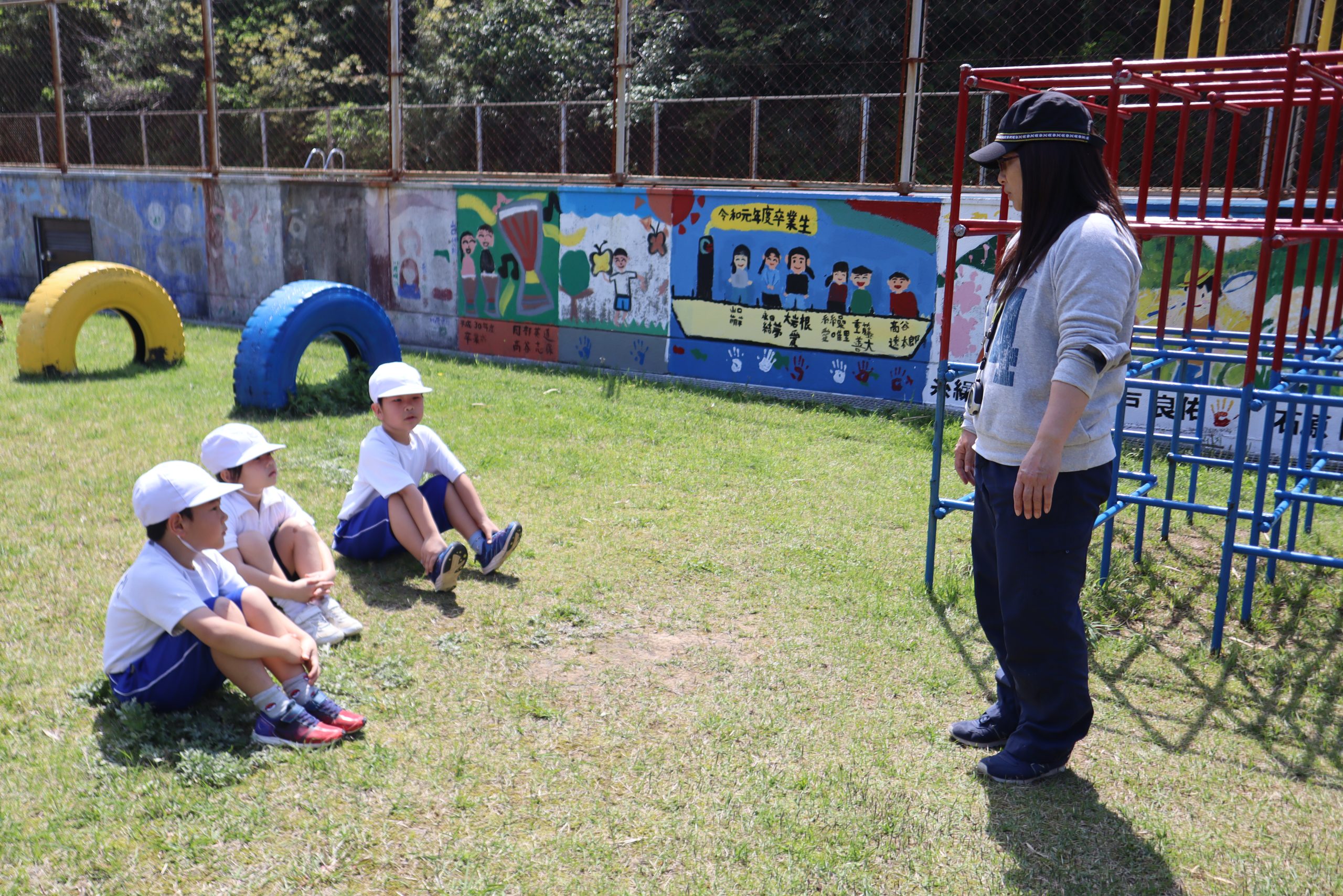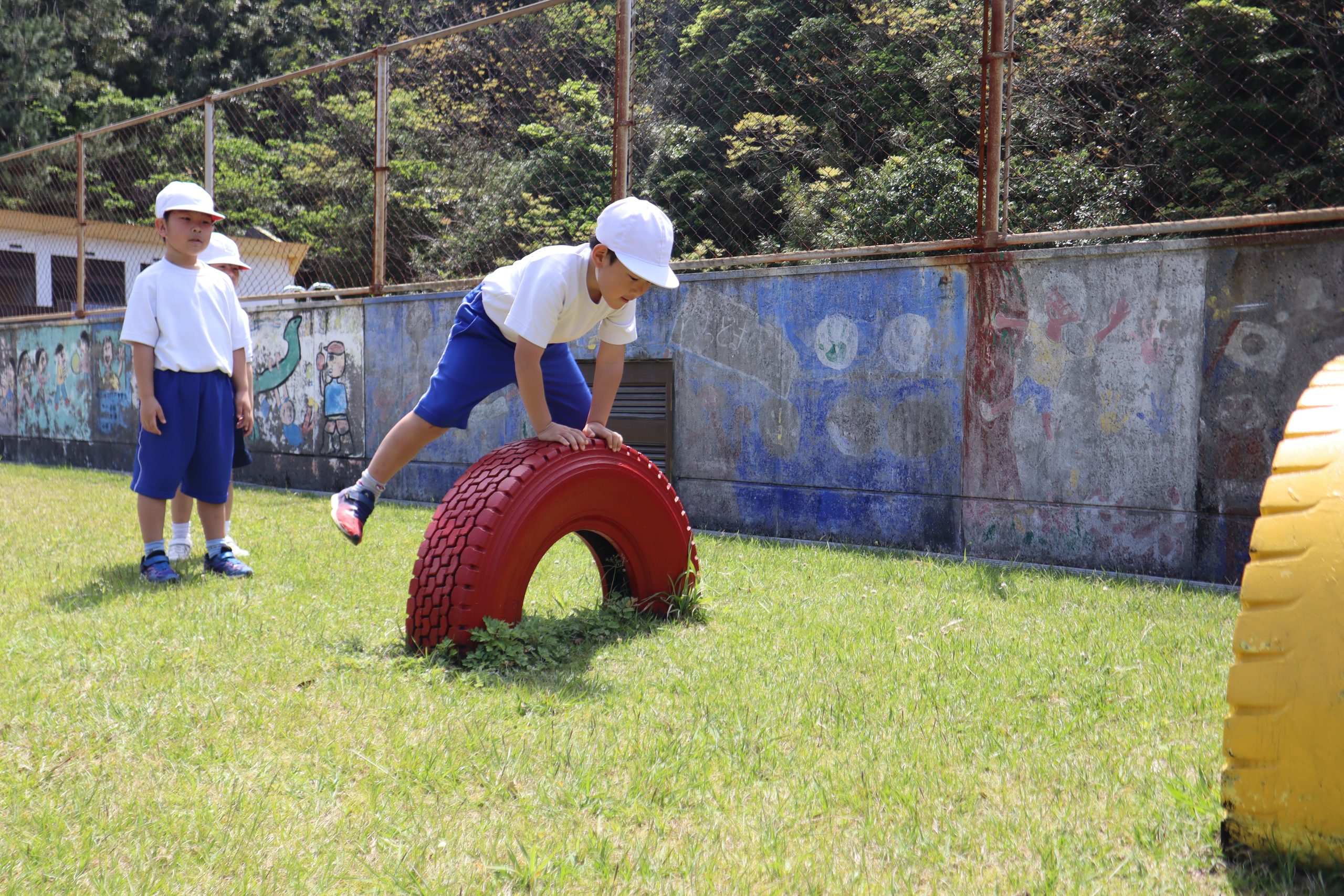 まずは、1・2年生の体育です。今年度、はじめての体育です。遊具の使い方について学んでます!