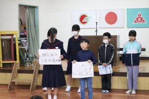 朝は、今年度初めての児童生徒朝会でした。生活委員会のみんなが正しいあいさつの仕方を