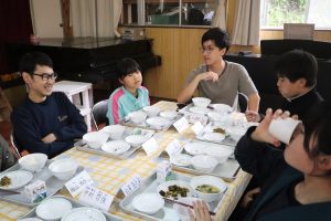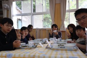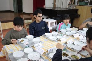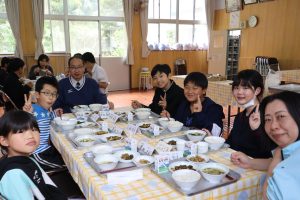 合同給食があり、全校の児童生徒、職員みんなで給食を食べました。普段と違う雰囲気やメンバーで、楽しく食事をすることができました。前期課程の低学年の児童が、「また合同給食したいなあ。」と話していました。