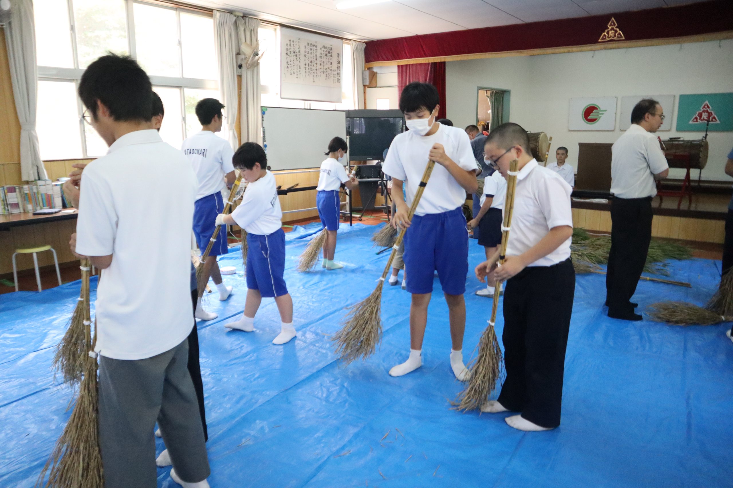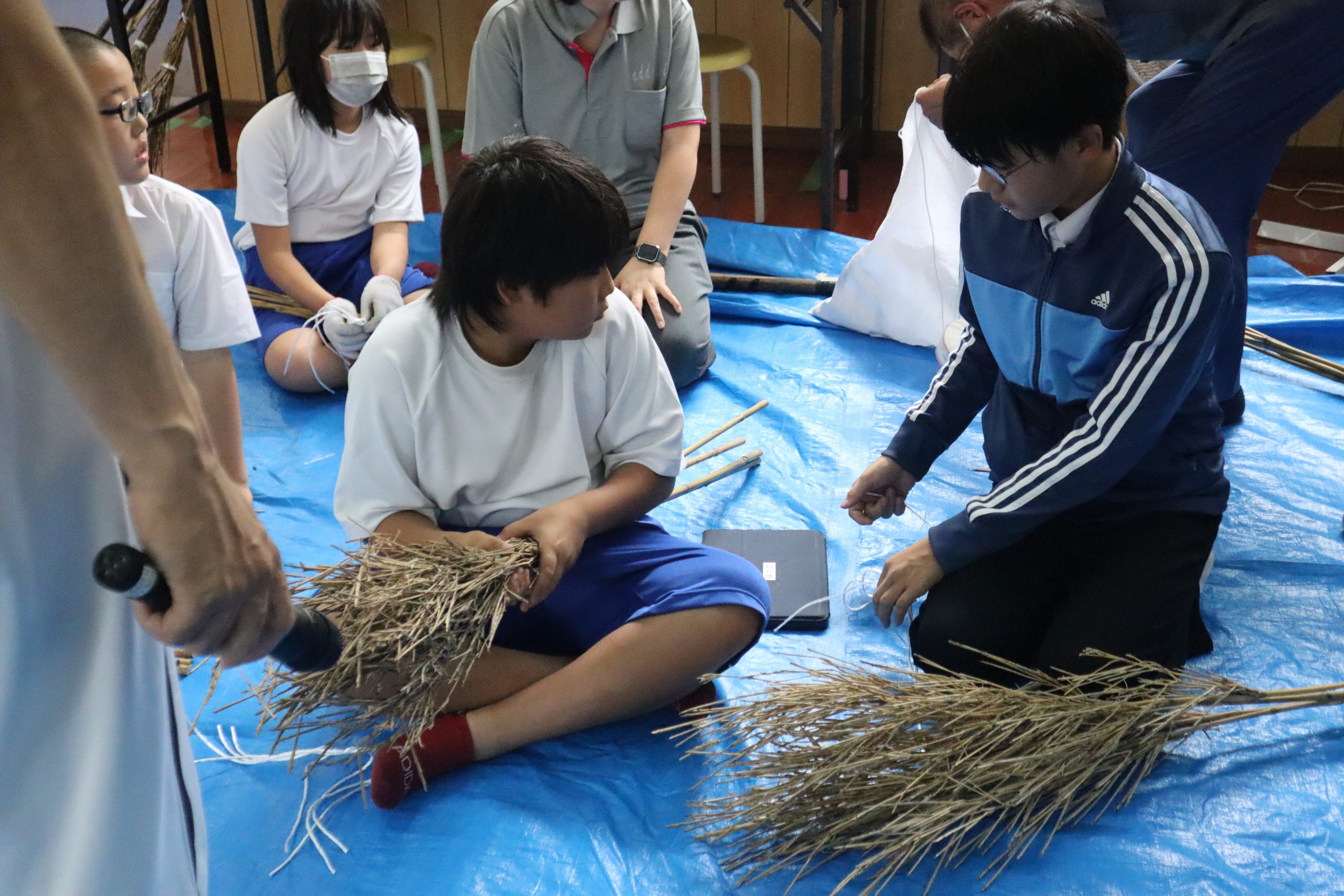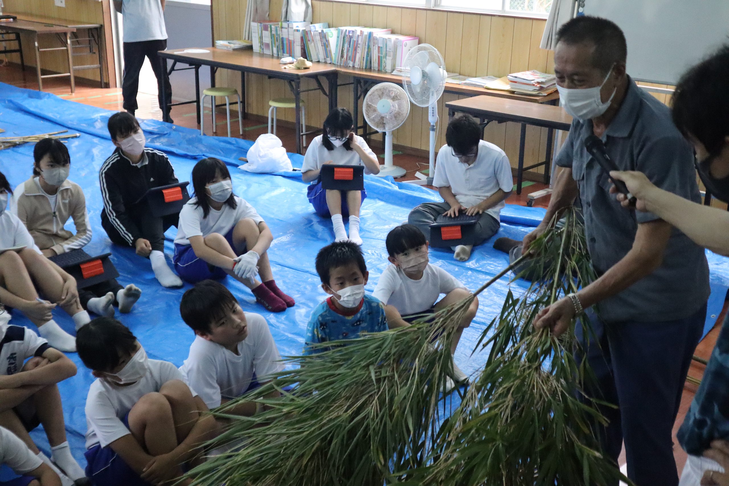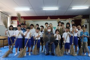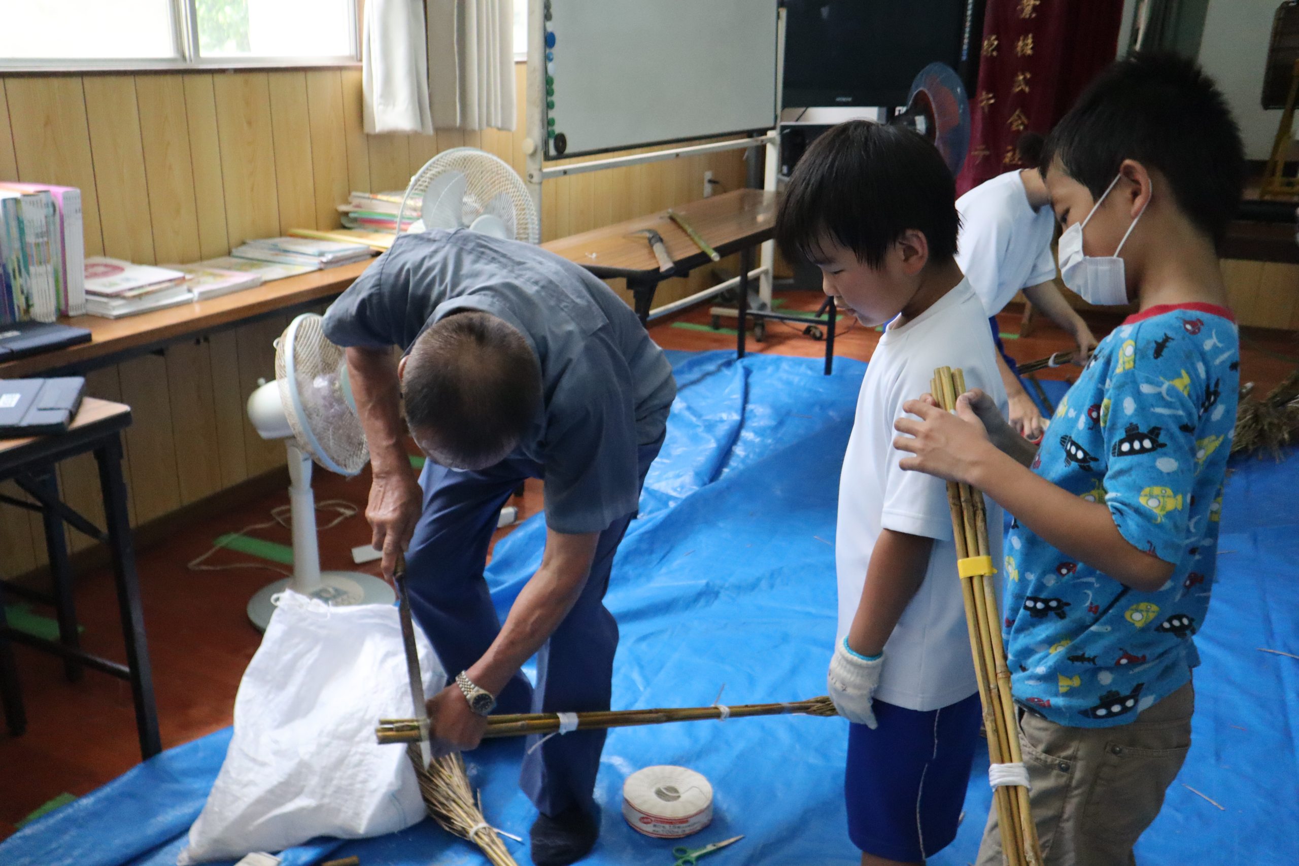 本日,地域の杉山さんに来ていただいて,全員で竹ぼうきを作りました。普段見慣れている竹からどうやってほうきを作るのか興味津々の子どもたち。竹ぼうきを作るのが初めてナ子が多く,とても楽しそうに作成していました。