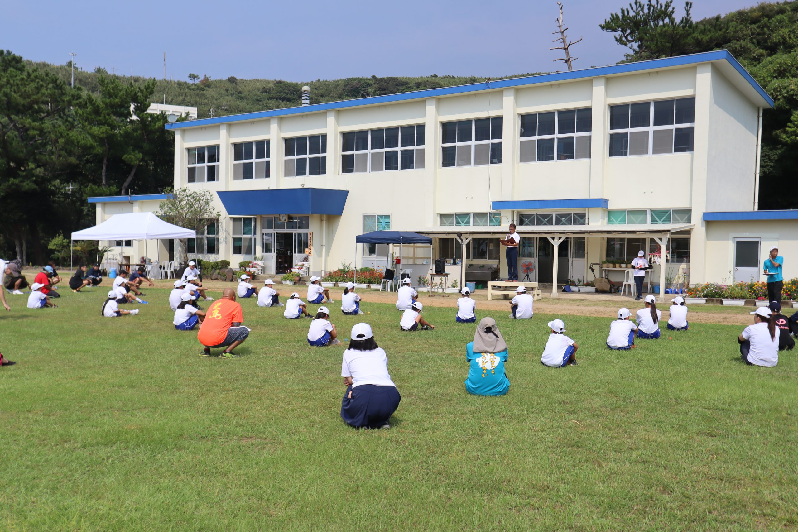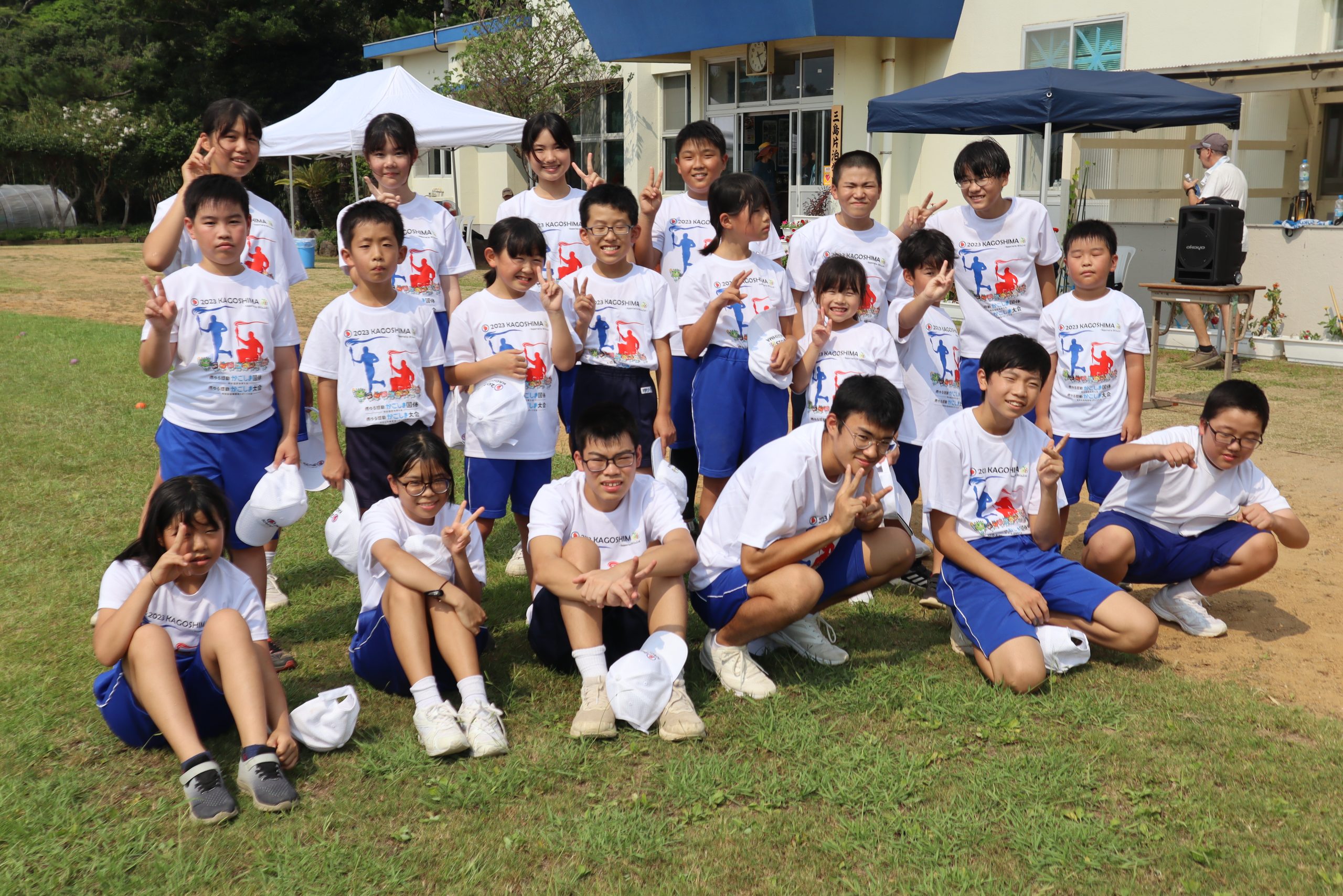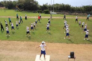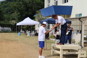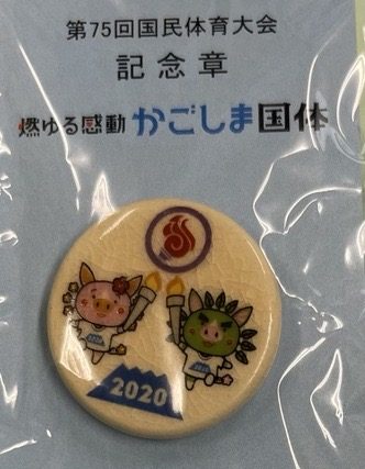 1ヶ月後に国体が鹿児島で開催されます。 そのデモンストレーションスポーツとして学園の児童生徒、地域住民が学校に集合! みんなでラジオ体操をしました。 暑い中でしたが、この活動を通し、国体が開催されることがみんなの記憶に刻まれました。 そして、記念品をいただきました。 ちょっと黄ばんだバッジ? いいえ! 薩摩焼(白薩摩)のピンバッジ!
