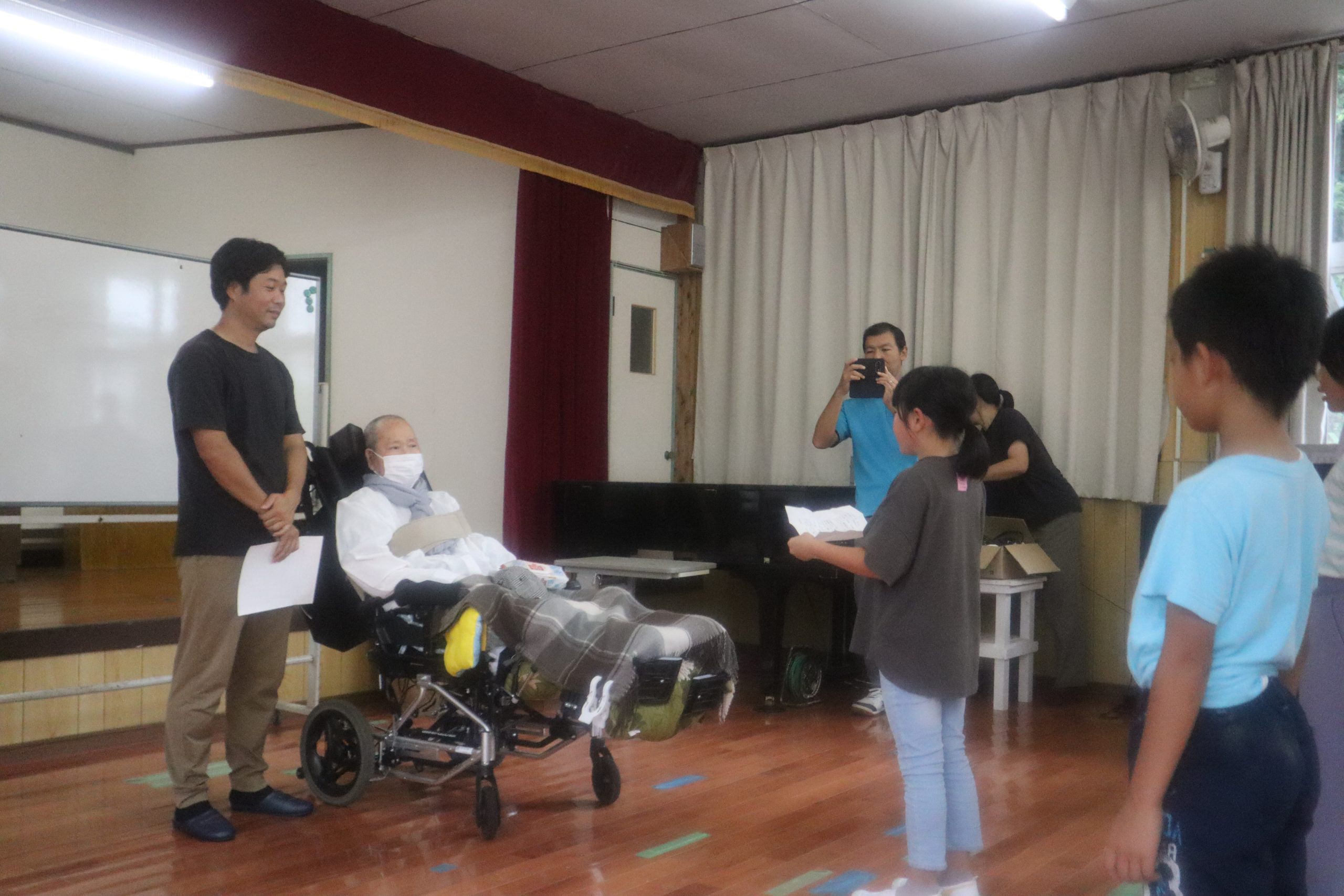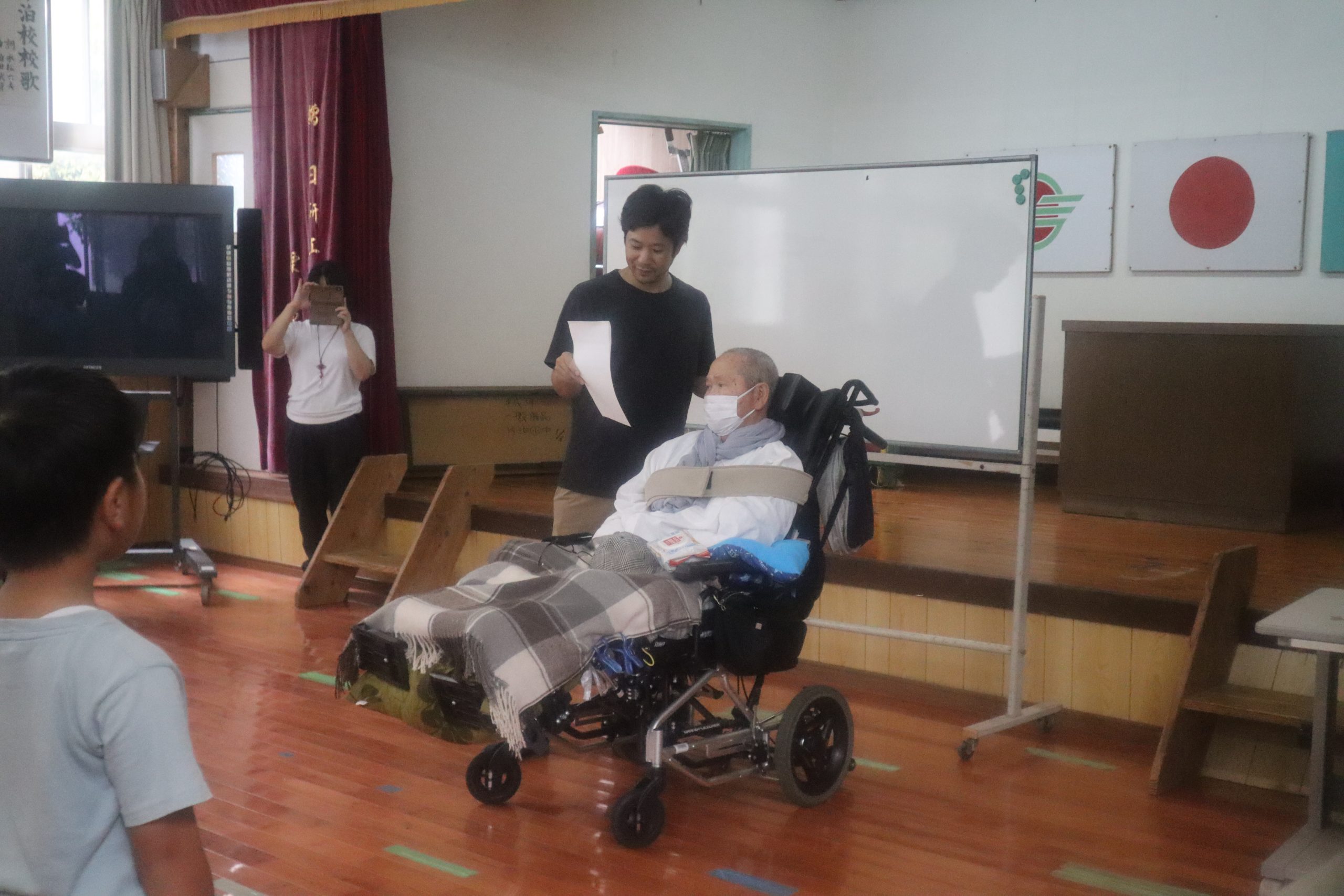 片泊出身の大先輩 岩﨑義治さん(77歳)が,久しぶりに帰郷され,児童生徒と交流しました。代表の児童があいさつし、そのあと一緒に校歌を歌いました。 学生の頃に歌ったそのままの校歌だったと喜んでくださいました。 児童生徒たちも先輩に元気の良い歌声を届けようといつも以上に真剣に歌っていました。 今回のように,島を離れて生活していらっしゃる多くの先輩方と,いろんな形で交流していけたらいいな,と思いました。