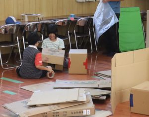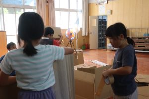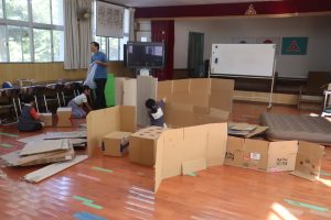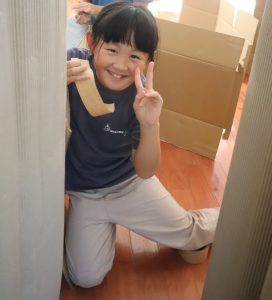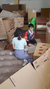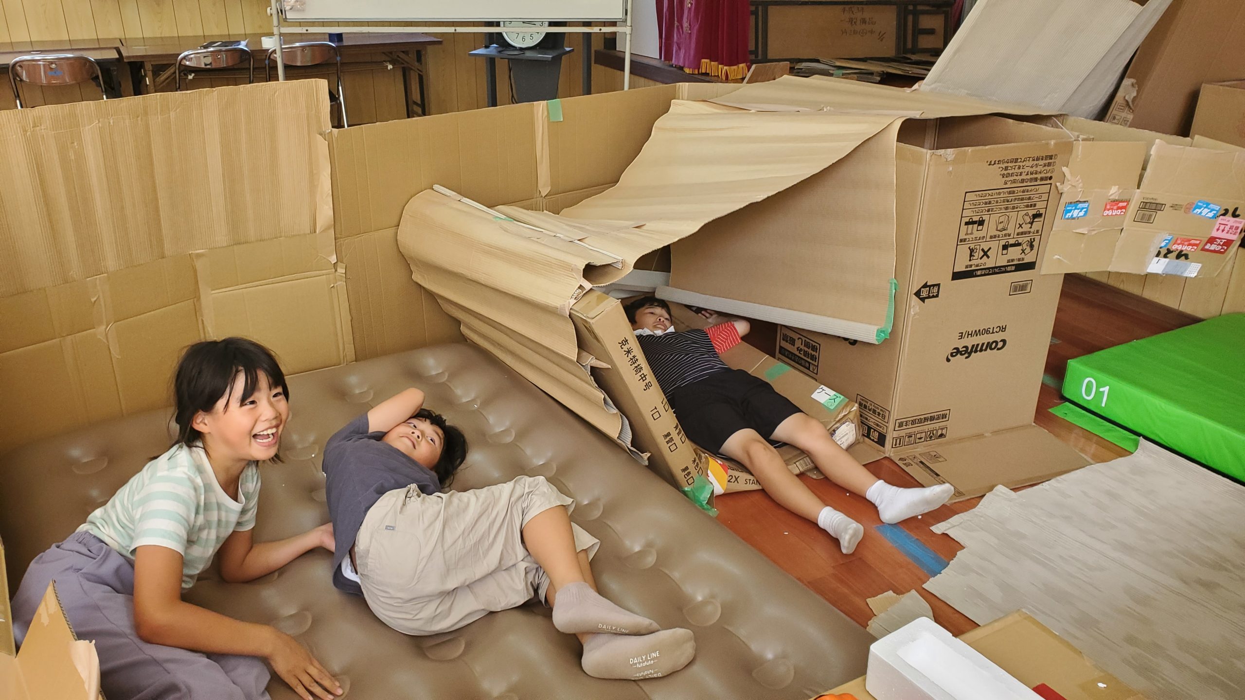 3・4年生が大里学園と合同で図工の学習をしました。集会室にたくさんの段ボールを広げ、3人で大きな家を作りました。部屋が分かれていたり、ロフトやエアベッドがあったりと本格的な家が完成しました。3人ともとても楽しそうでした。これからもいろいろな交流ができればと思います。