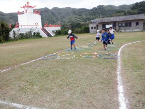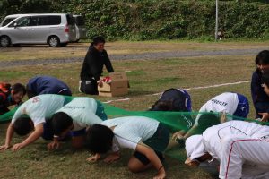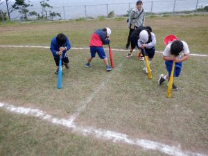 後期課程は2時間目 Tボールという球技の対戦です。ソフトボールのようなルールです。後期課程生はお休みの日も集まって練習していました。練習の成果は出たかな?