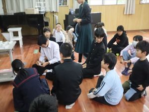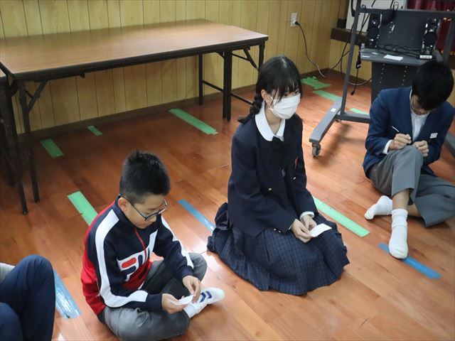 今朝は「児童生徒朝会」が行われました。各専門部からの報告の後,「いつ,だれが,どこで,何をしたゲーム」を行いました! 異年齢でチームを作って,お題にそって,各々自分のワードを書いていきます。 <いつ> 「100年後の未来…」 <だれが> 「アリが…」 <どこで> 「火山の中で…」 <何をした> 「サーフィンをした…」 <そのあとどうした> 「海の中に落ちた…」 などなど,楽しい文章が出来上がりました! みんなの笑顔がキラキラ光る集会活動となりました(*^▽^*)