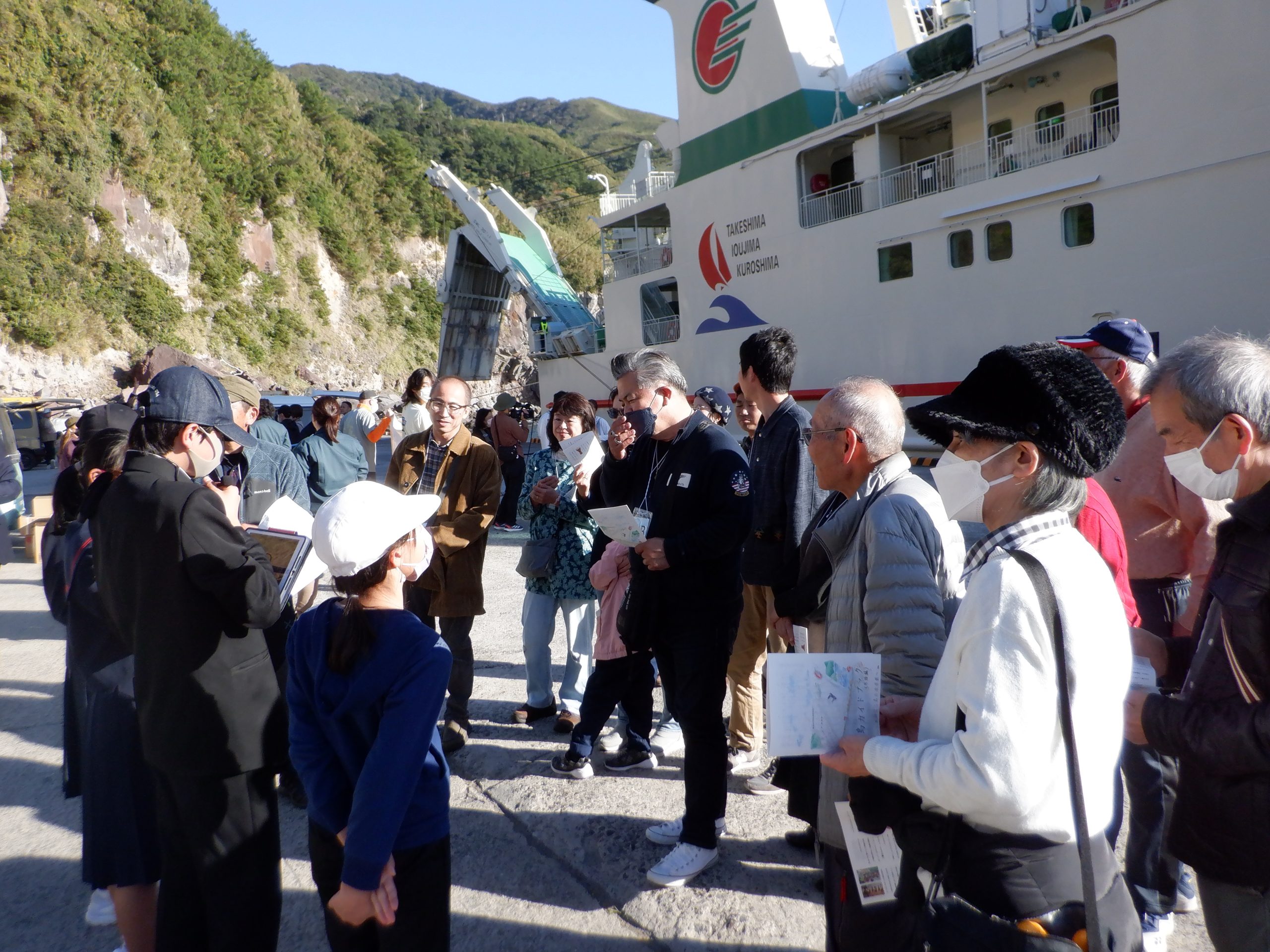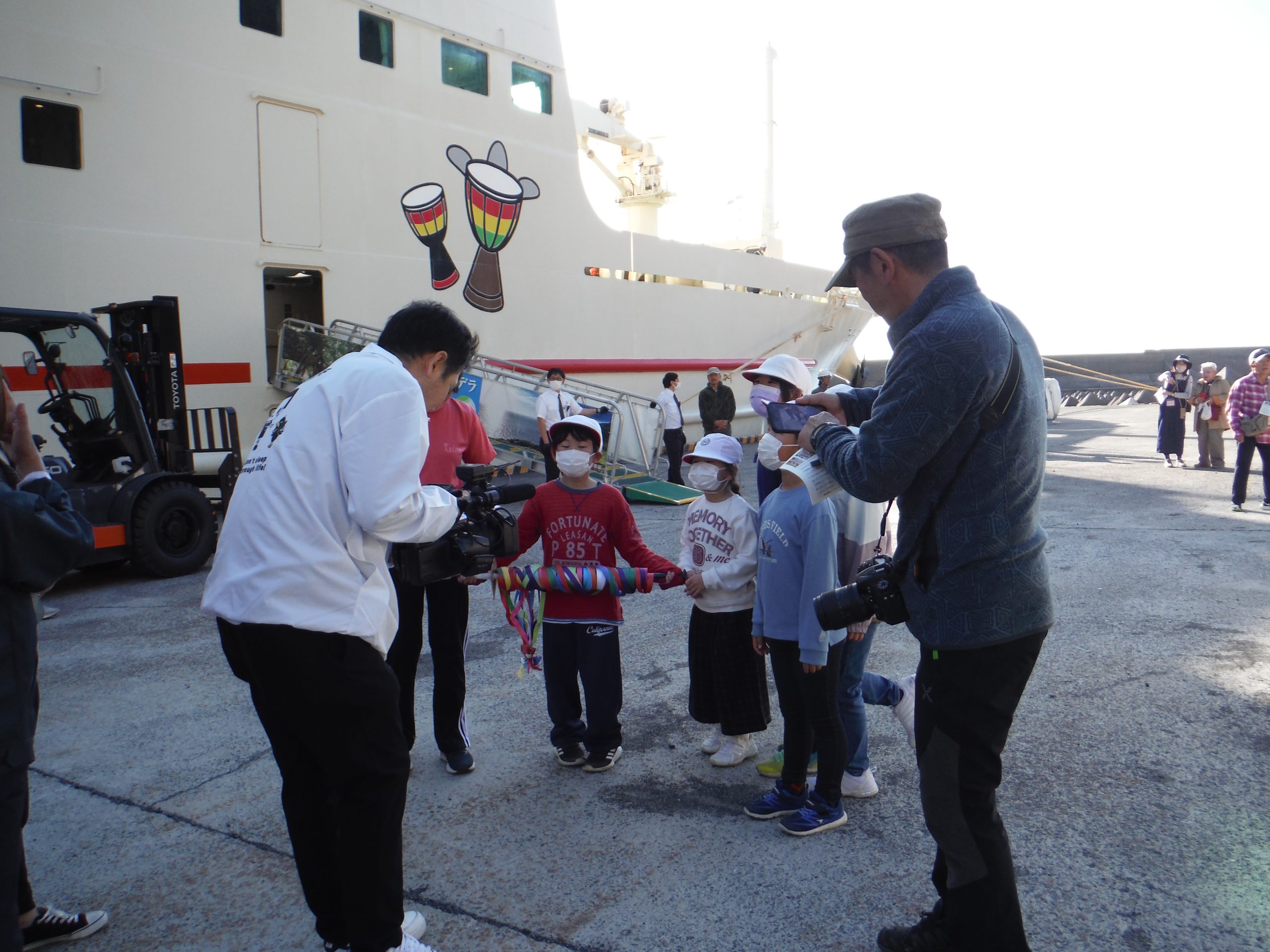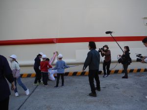 きょうは、みしまワンデージオクルーズツアーが片泊港に来ました。 後期課程生が黒島クイズでもてなしました。 NHK「チコちゃんに叱られる」の撮影・取材もきていました。 かわいい前期課程生が取材を受けていました。 どんな放送になるのか,わたしたちも楽しみです。