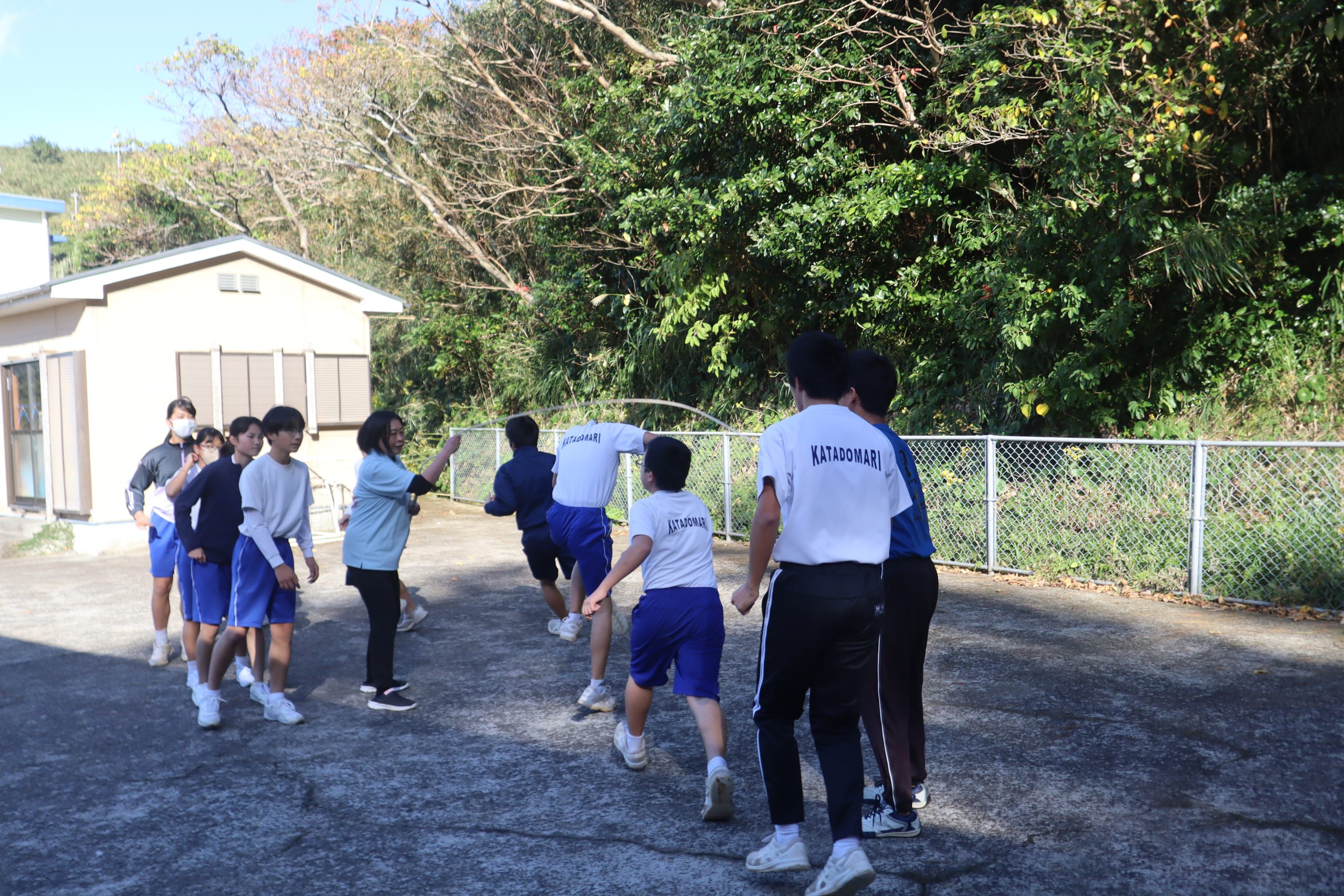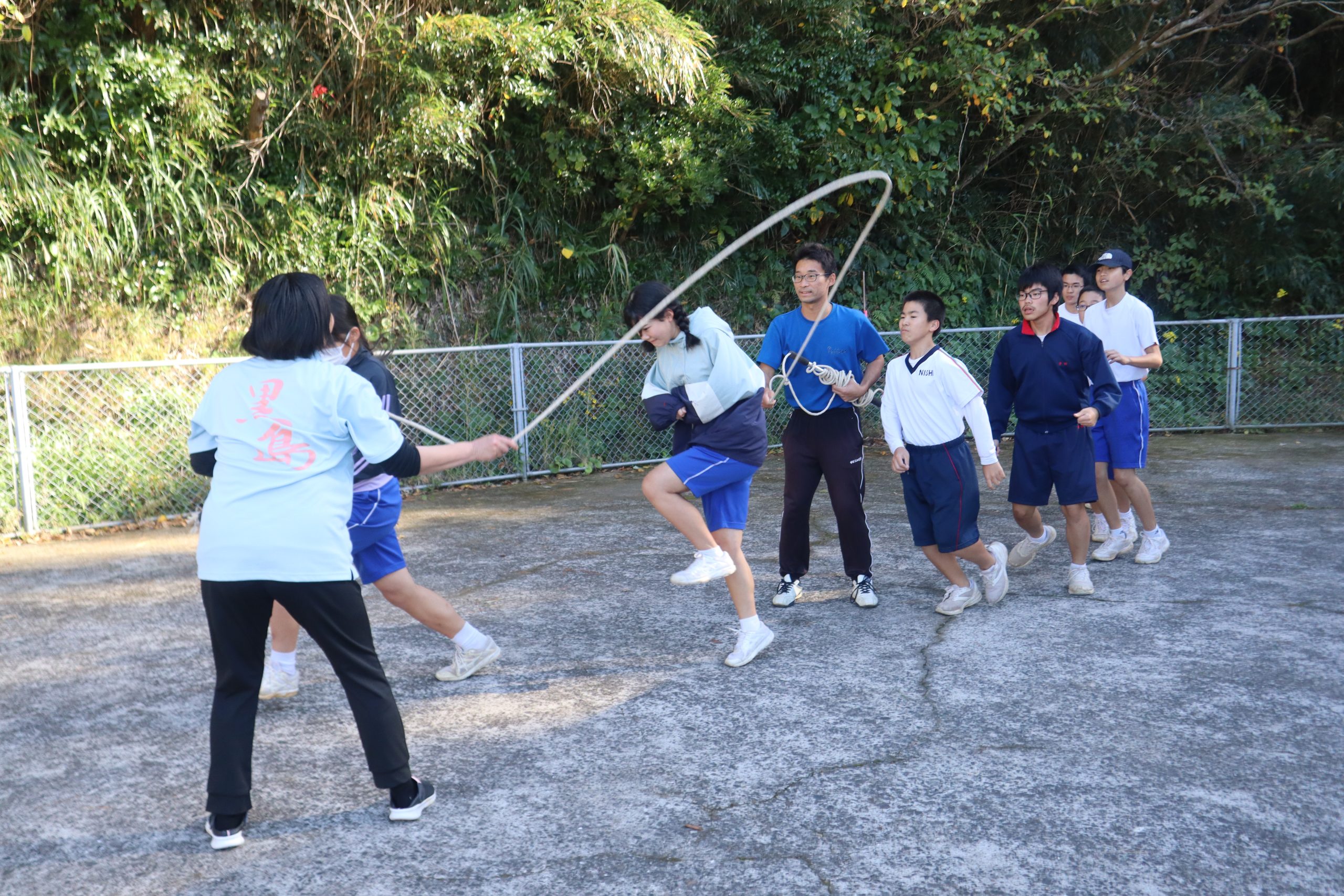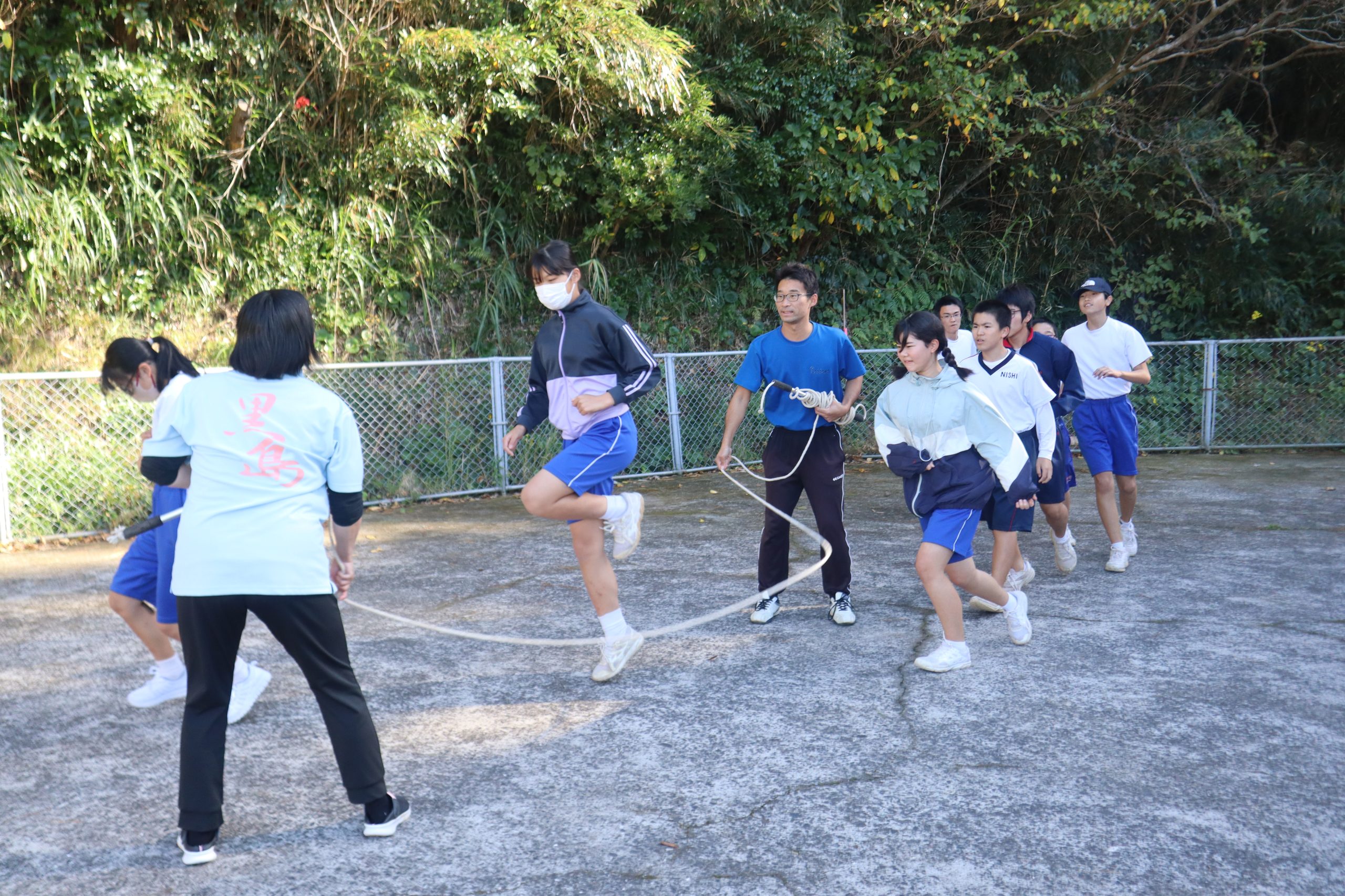 今日の後期課程生の体育は、長縄をしていました。その名も「長縄エイトマン」(8の字跳び)です。 これは、チャレンジかごしまの種目の一つで毎年前期・後期共に頑張っています。今日は、久しぶりの 長縄エイトマンでした。この種目は3分間で何回跳べるかを競う種目です。 今日の記録は、239回でした。まだまだ記録を伸ばします。頑張るぞ!!