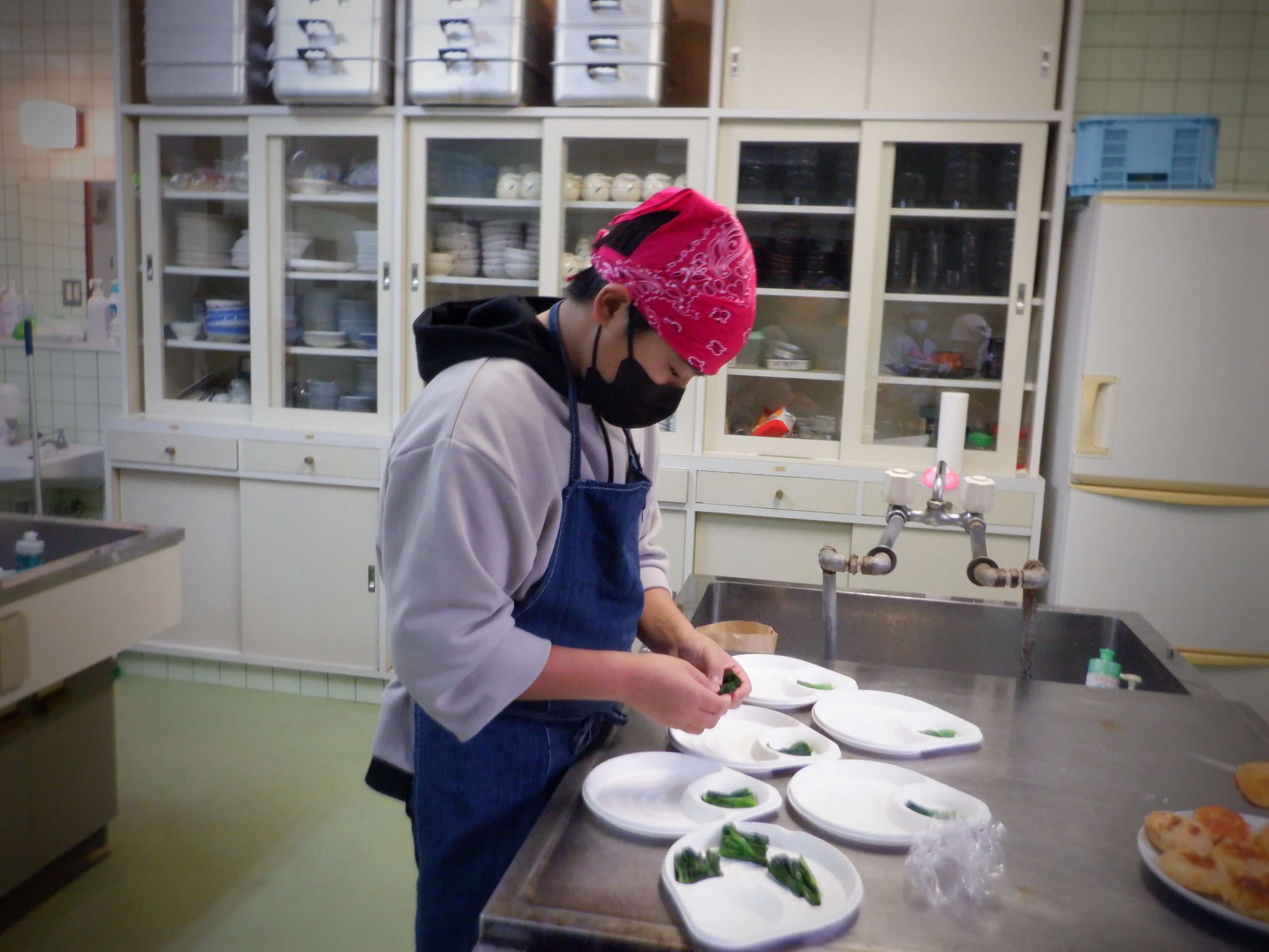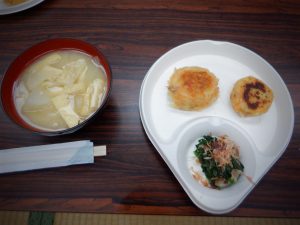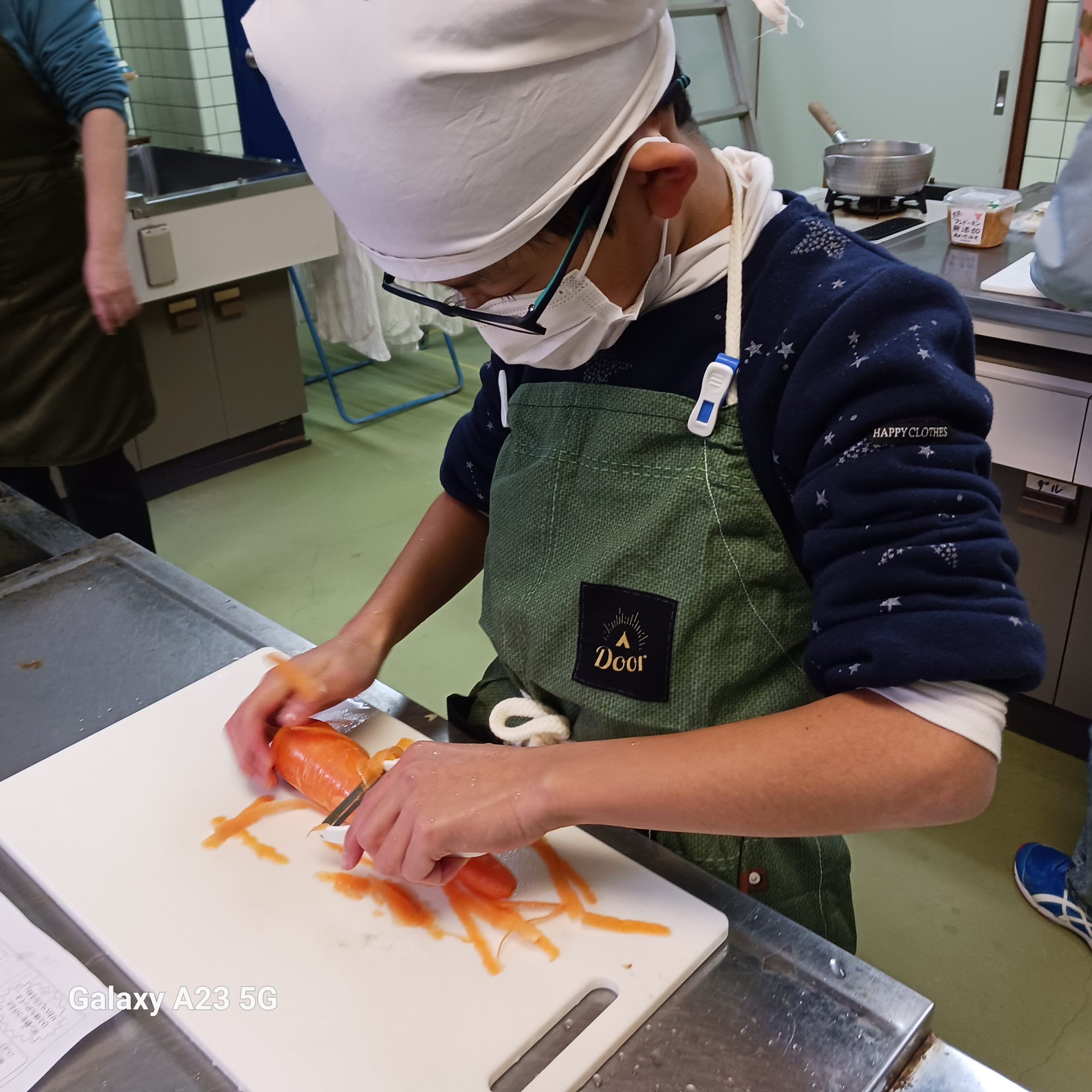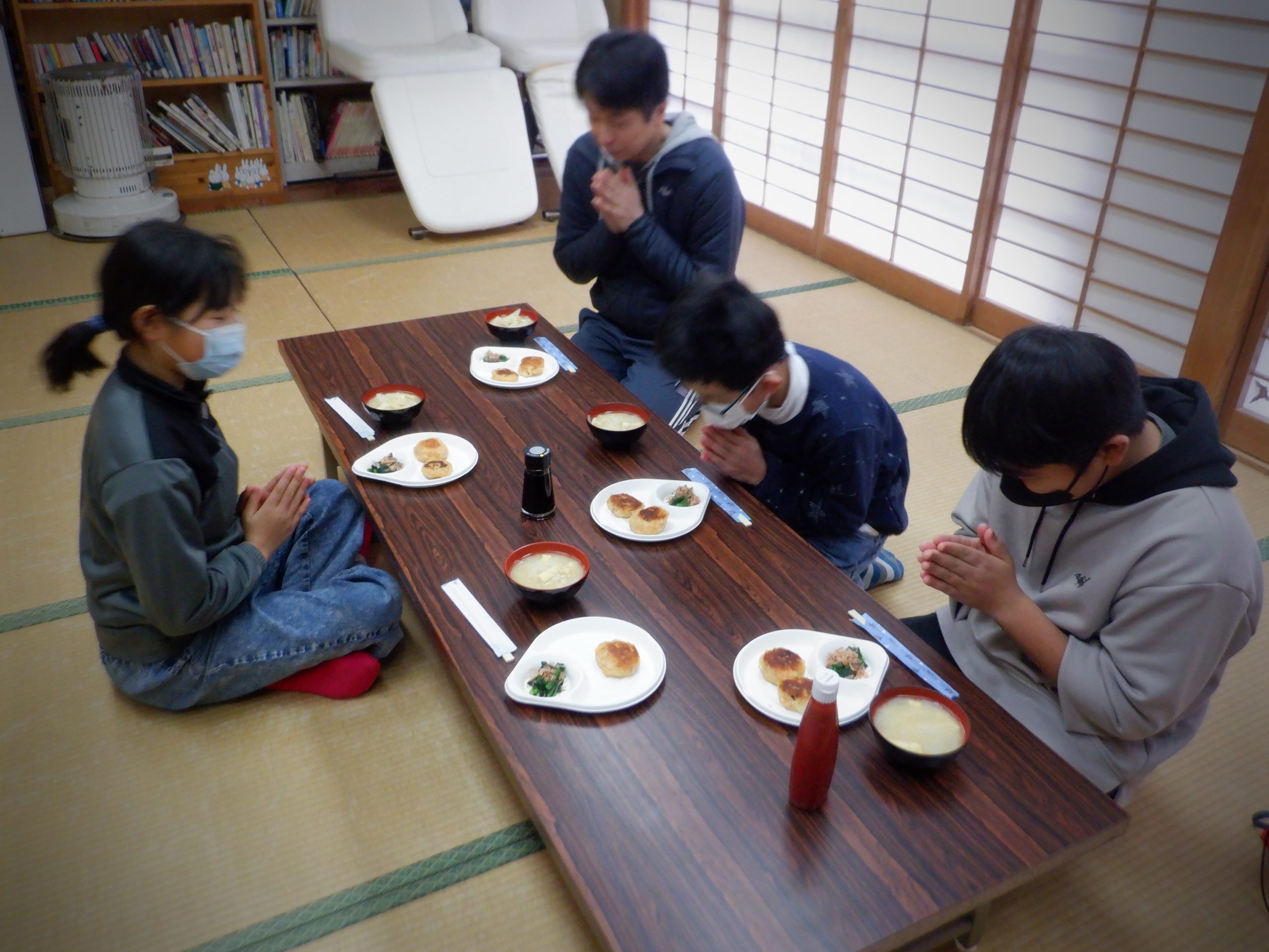 みんな大好き調理実習 今回は5・6年生の活動についてご紹介します。 今回のメニューは ・ツナポテトハンバーグ ・青菜のおひたし ・お味噌汁 何だかとても様になる調理姿です。お家でも調理にチャレンジしているのでしょうか。 おや、ツナポテトハンバーグもニコニコしています。 立派な一食分のメニューが完成しました。 ご飯が欲しいところですが・・・今回はおかずだけです。 担任の先生もご招待して、みんなで「いただきます!」 この後学校に帰り、給食をいただきました。 満腹満足の一週間のスタートとなりました。