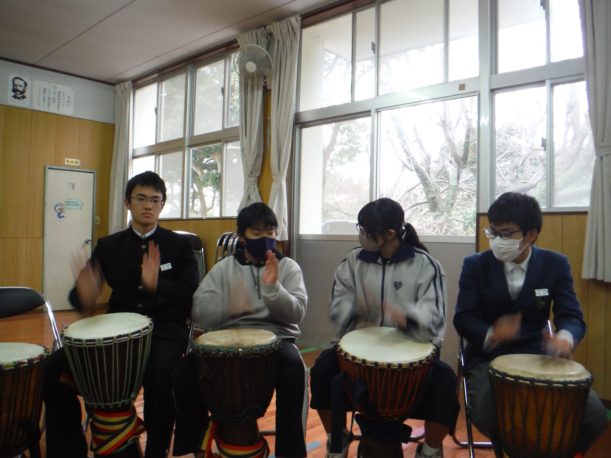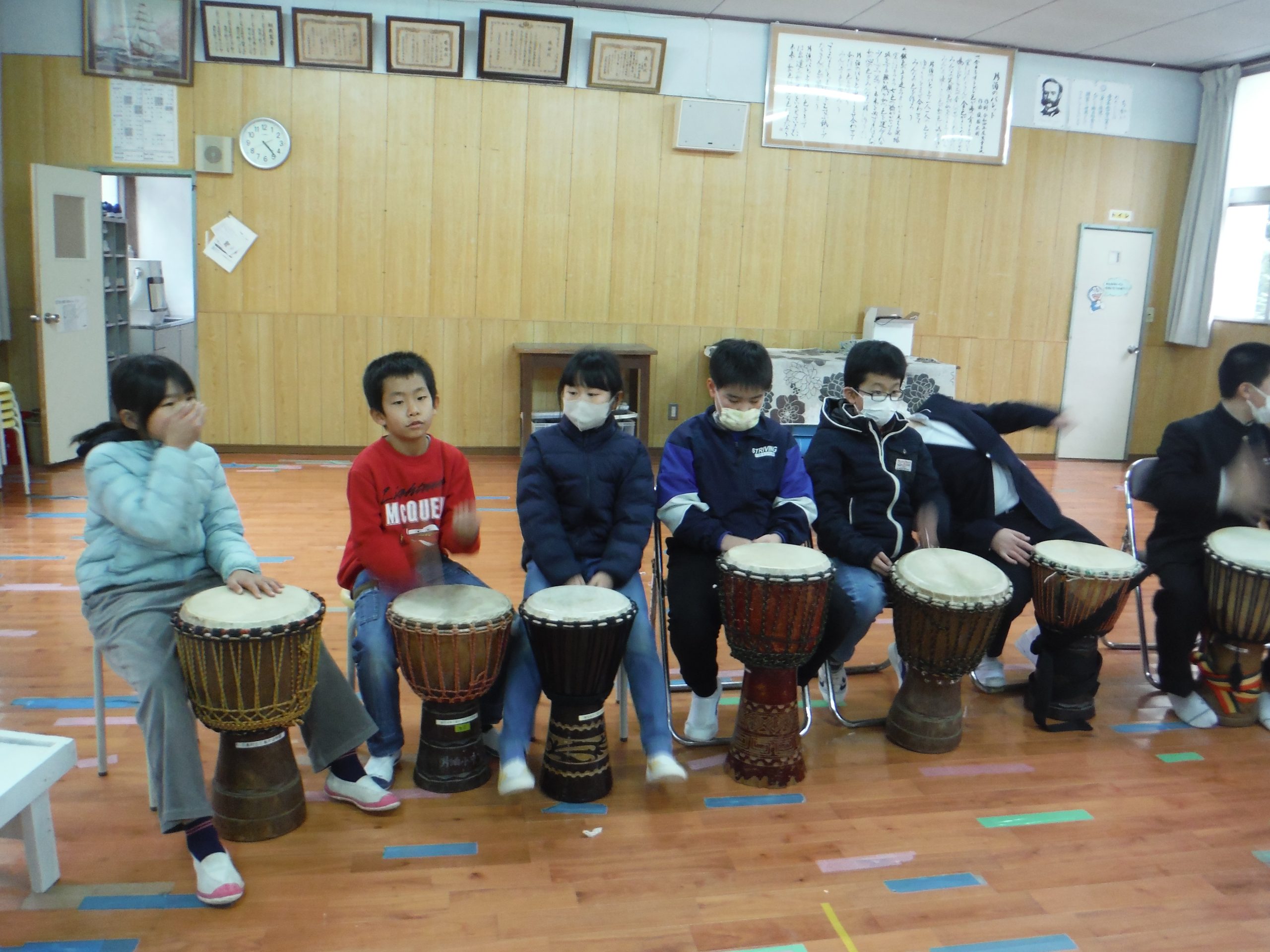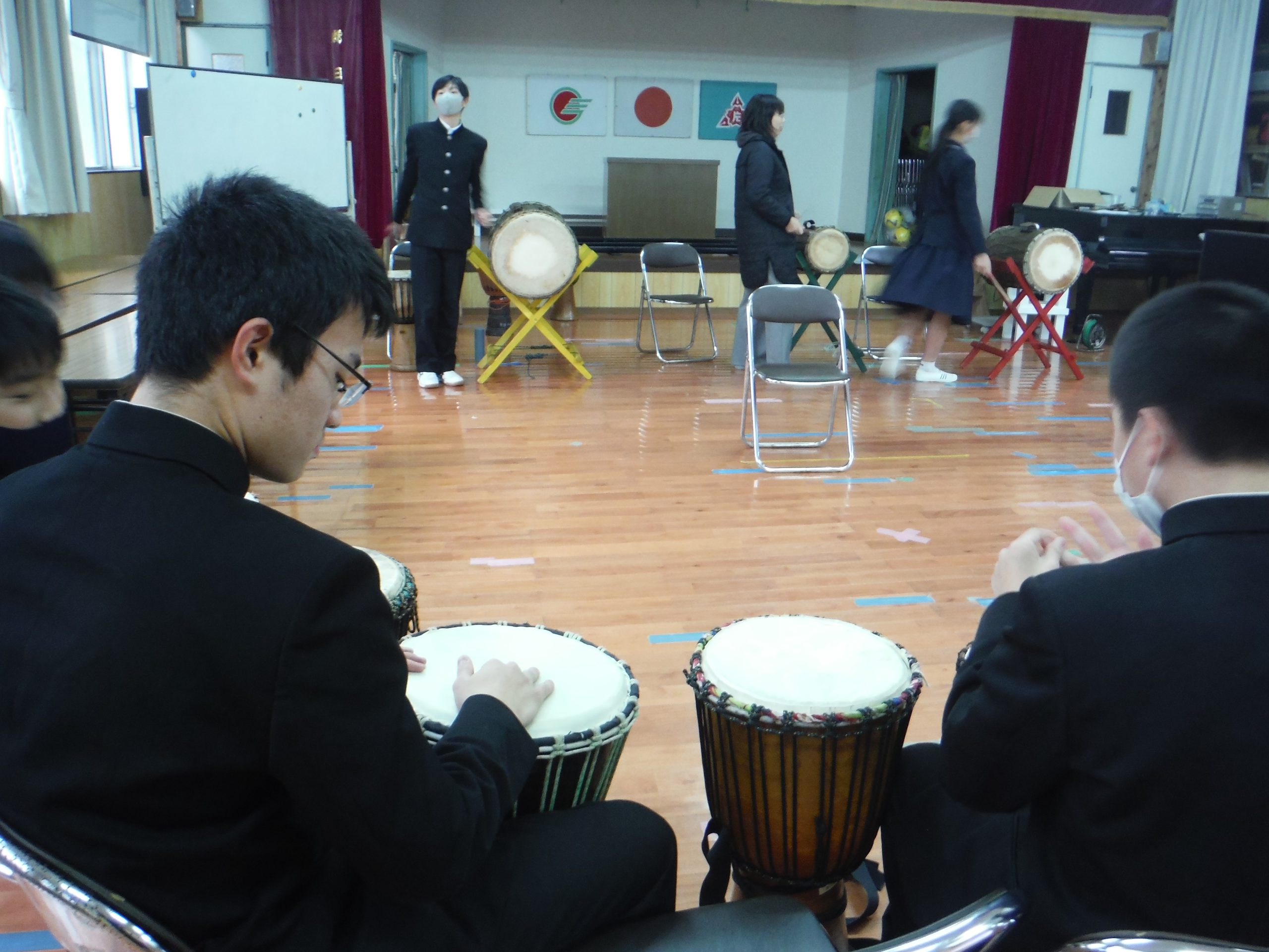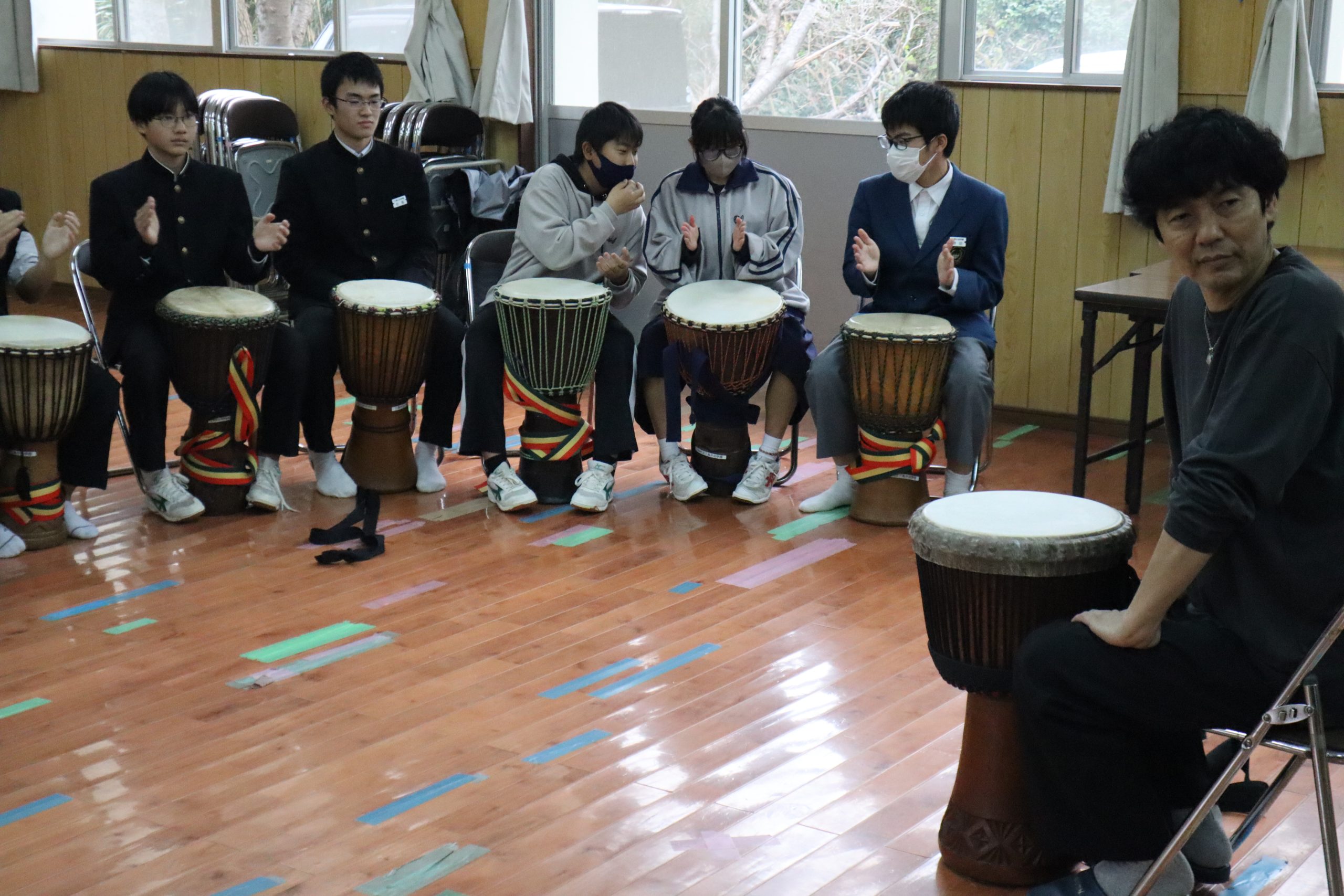 本日は,徳田先生のジャンベ教室がありました。 9年生は,徳田先生との最後のジャンベということで,気持ちのこもった演奏となりました。 最後は,9年生のリクエストで,「ヤンカディマクル」をして締めくくりました。