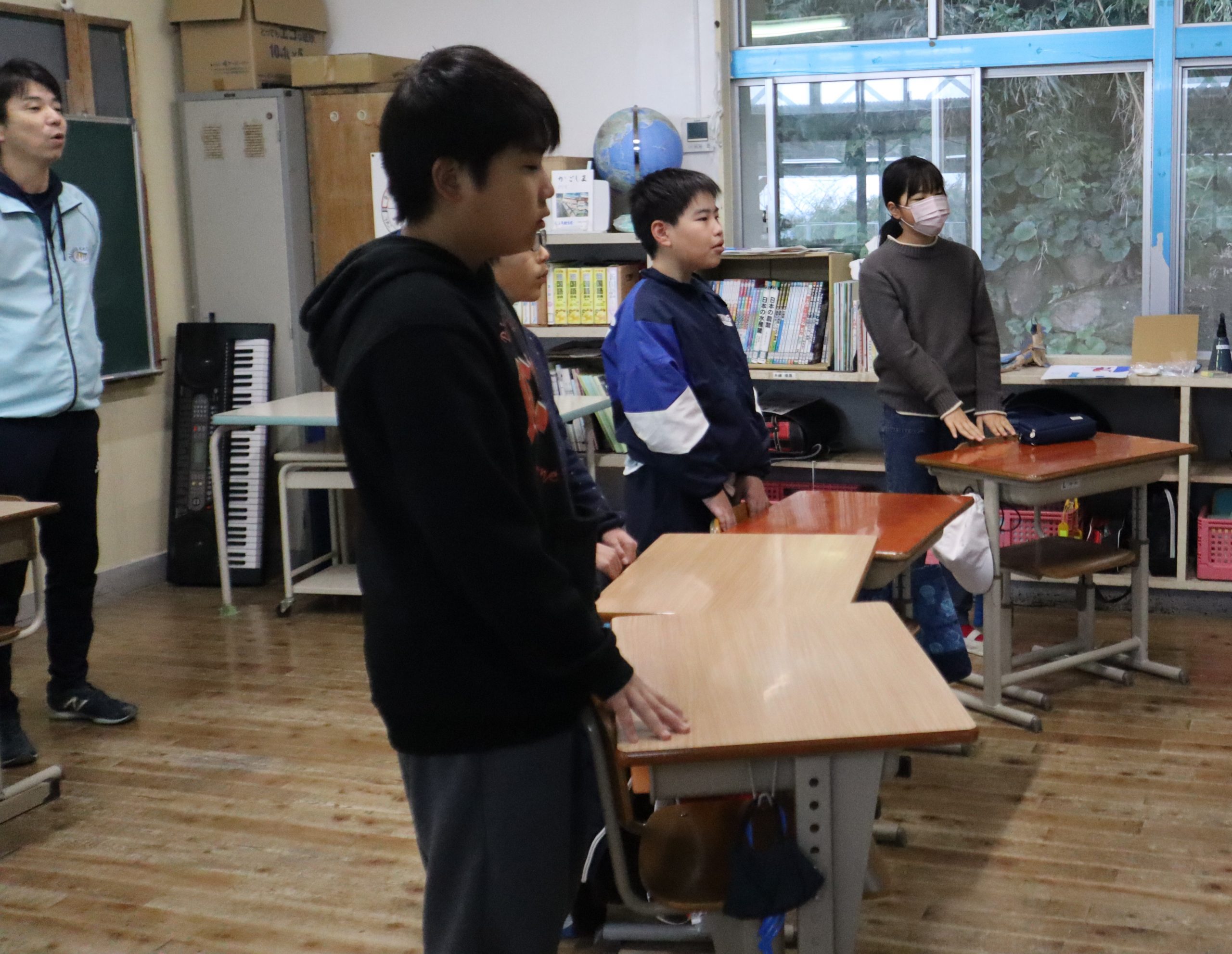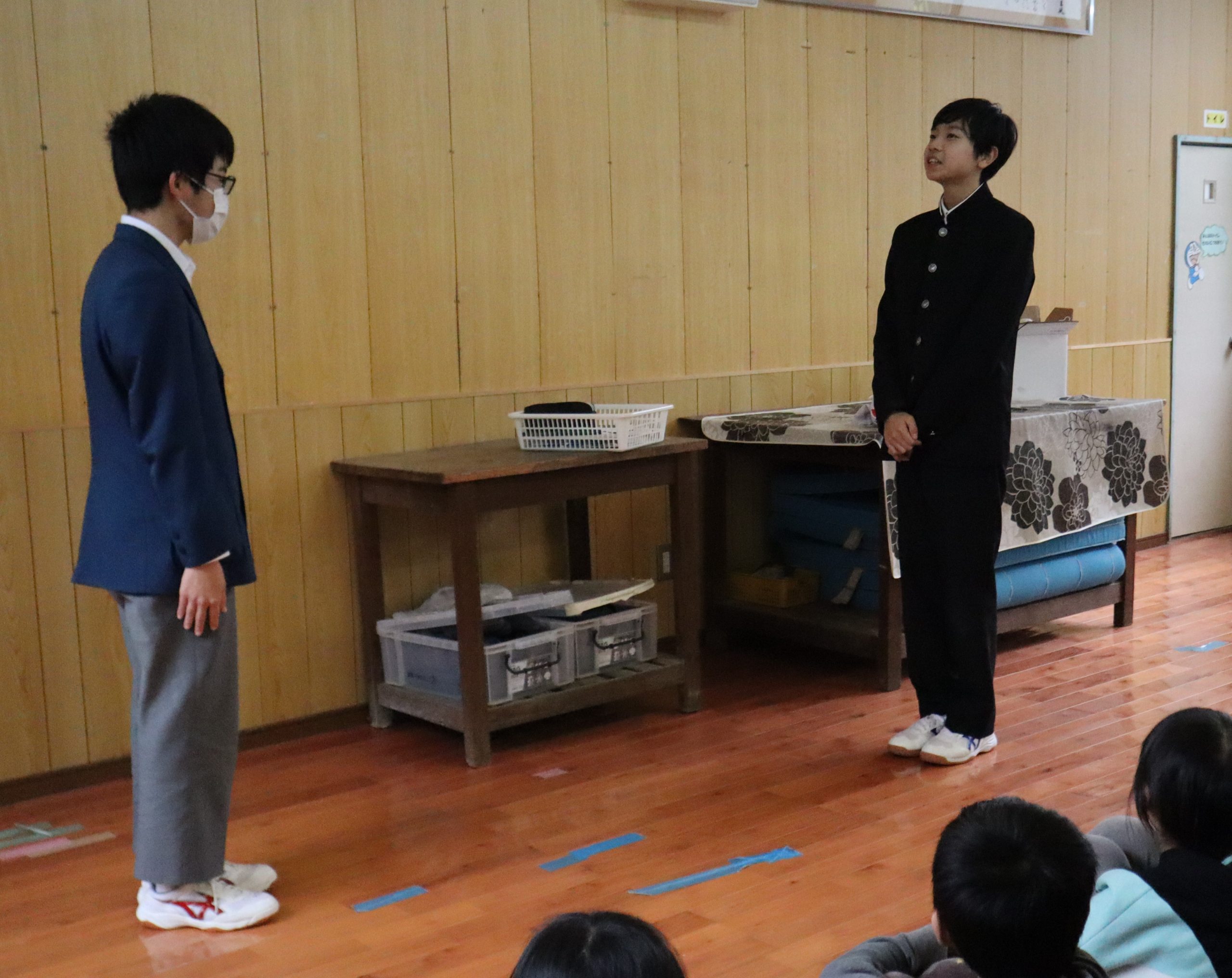 朝の歌の時間です。今月の歌は、卒業式に歌う歌です。「旅立ちの日に」「大切なもの」です。