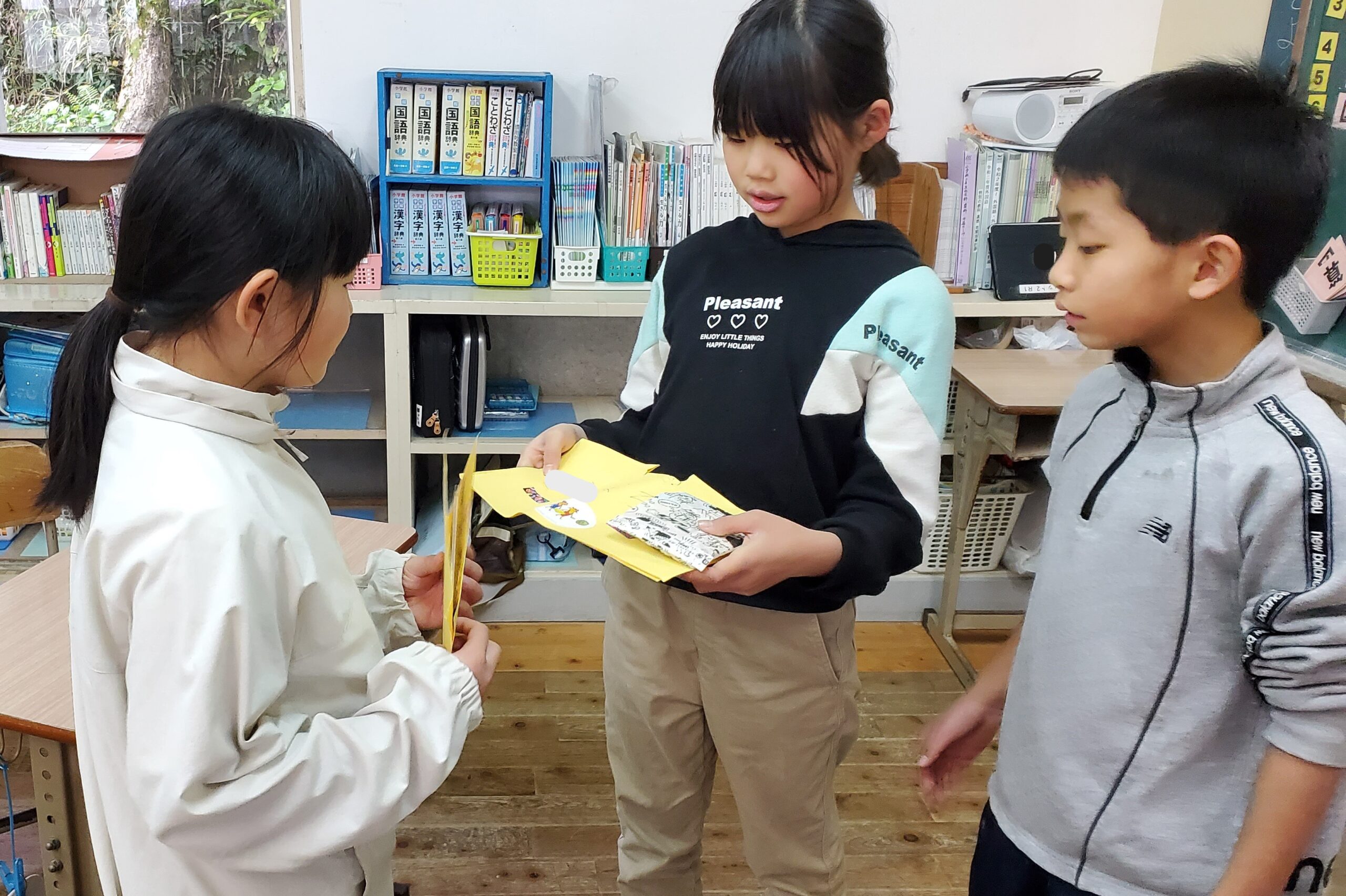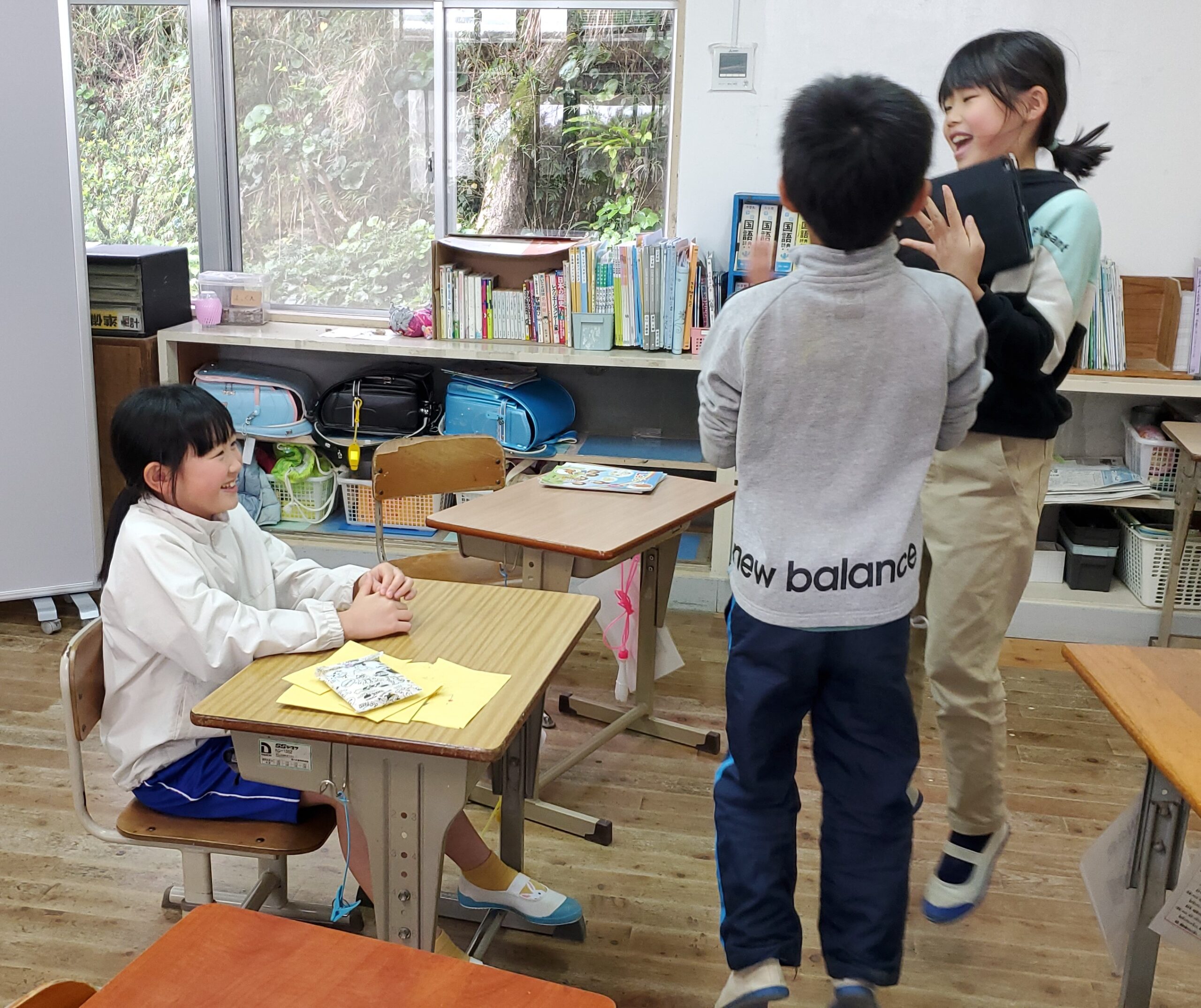 本日の片泊学園では、お祝い事がありました。3・4年生教室で誕生日パーティーがありました。3・4年生の子どもたちは、いつも仲良し3人組!