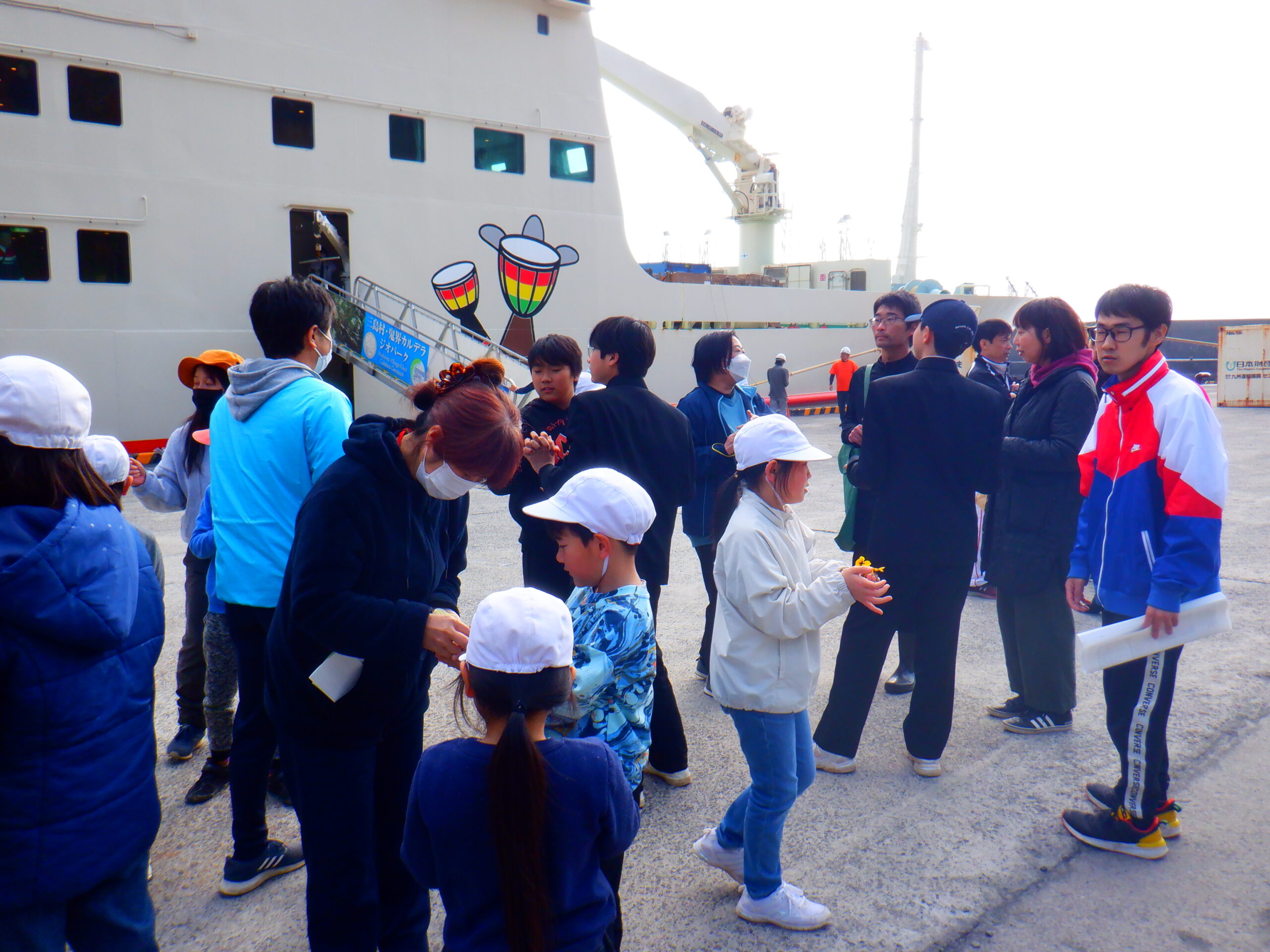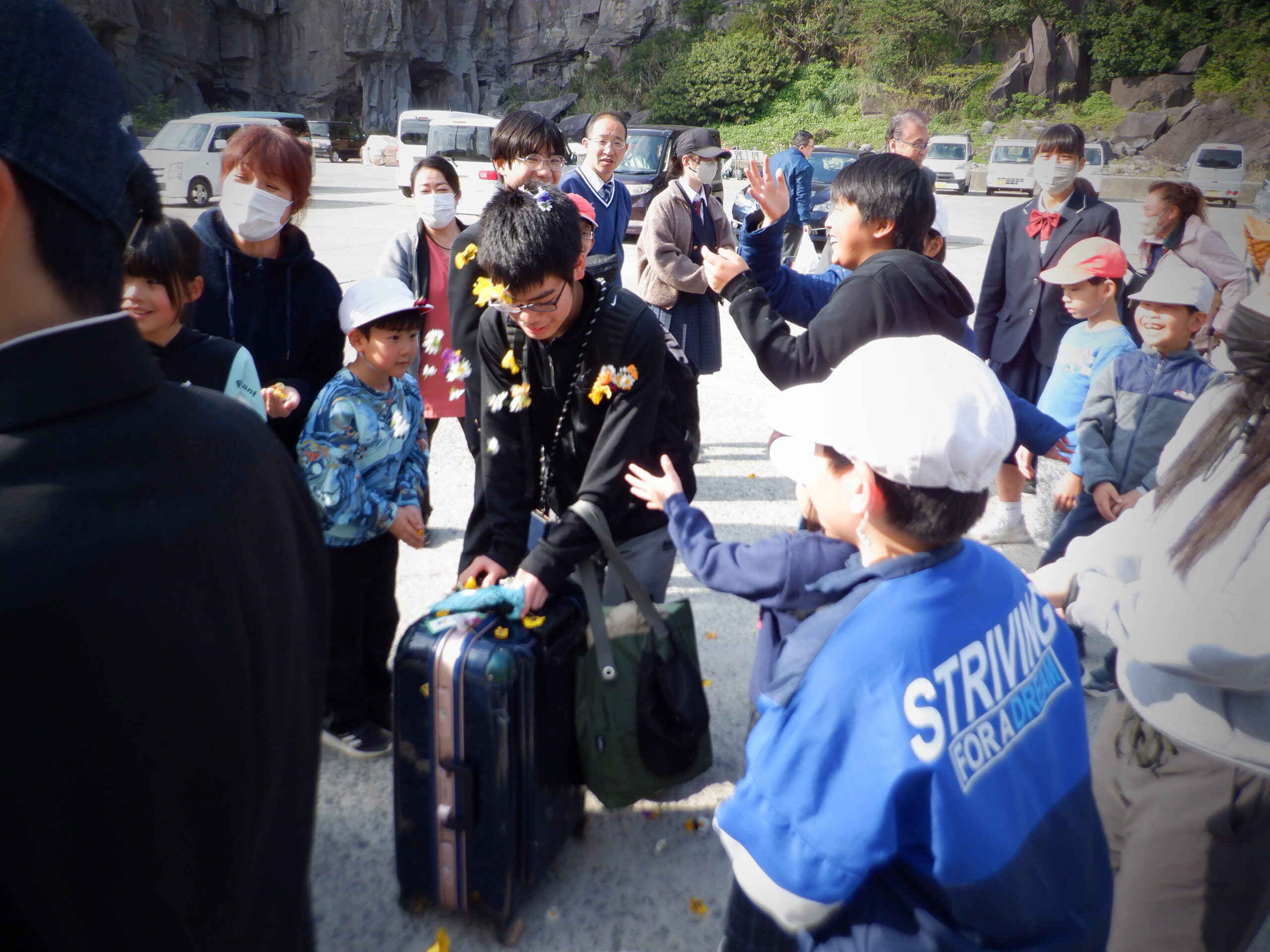 今日は、9年生1名の島立ちの日でした。フェリーが出航する前に出発式を行い、地区の方やPTA会長、校長先生に激励の言葉を頂きました。乗船後は、紙テープで最後のお別れをしました。三島片泊学園で学んだことを今後も大切にしながら、高校でも全力で頑張ってほしいです。