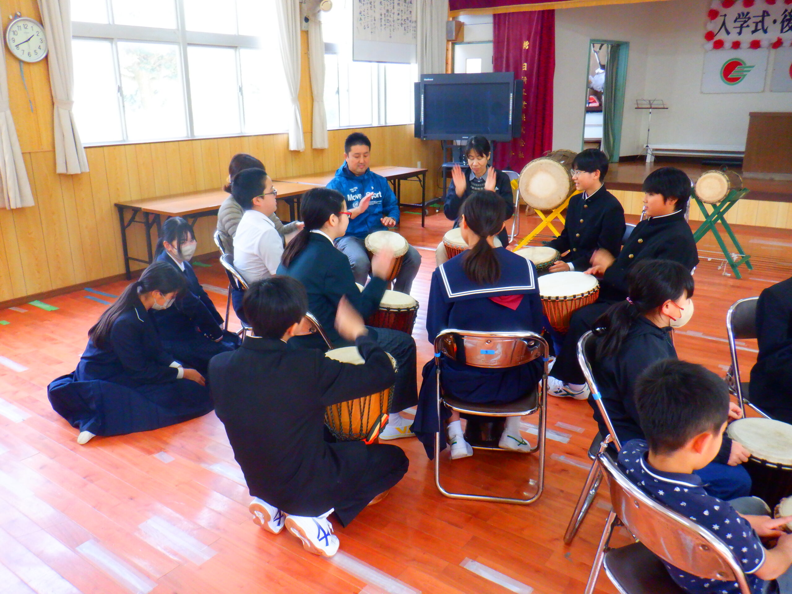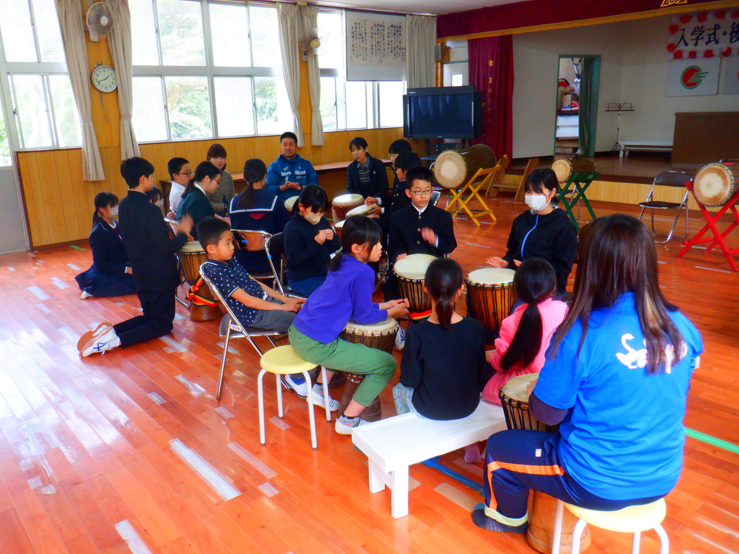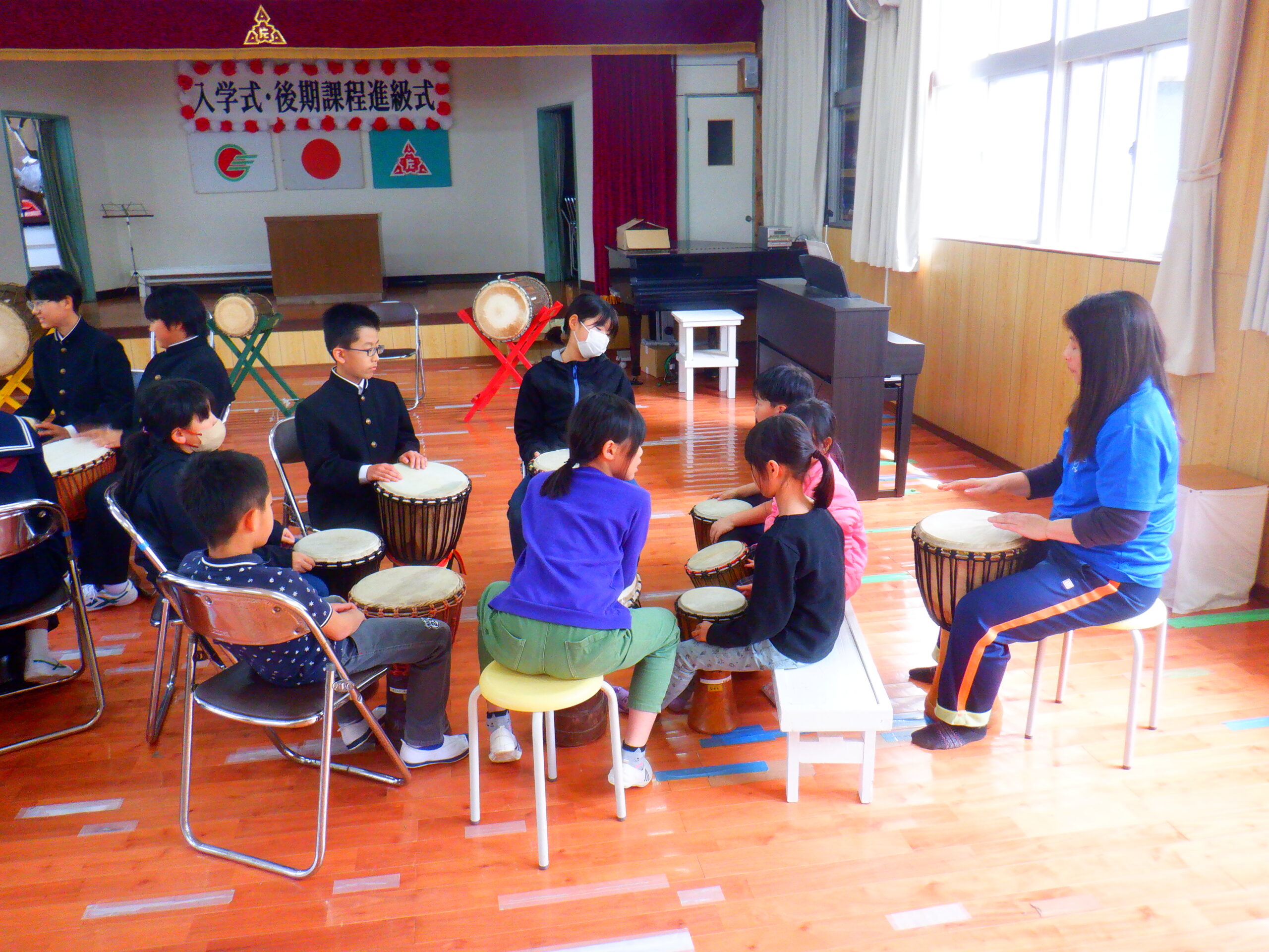 三島片泊学園では,毎週水曜日の昼休み,30分程度のジャンベの練習を全校児童生徒で行っています。 今日は本年度初。転入してきた児童生徒や先生方も加わっての初練習でした。 後期課程生のパートと前期課程生のパートに分かれて子どもたちが教えています。 三島村では,ジャンベの演奏をとても大切に受けついでいます。 新しく来られた皆さんが,ジャンベ楽しんでくれますように♡