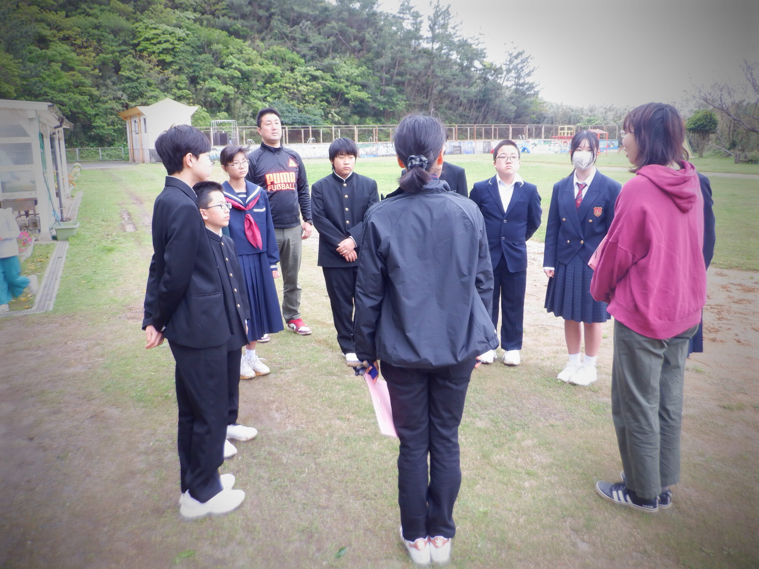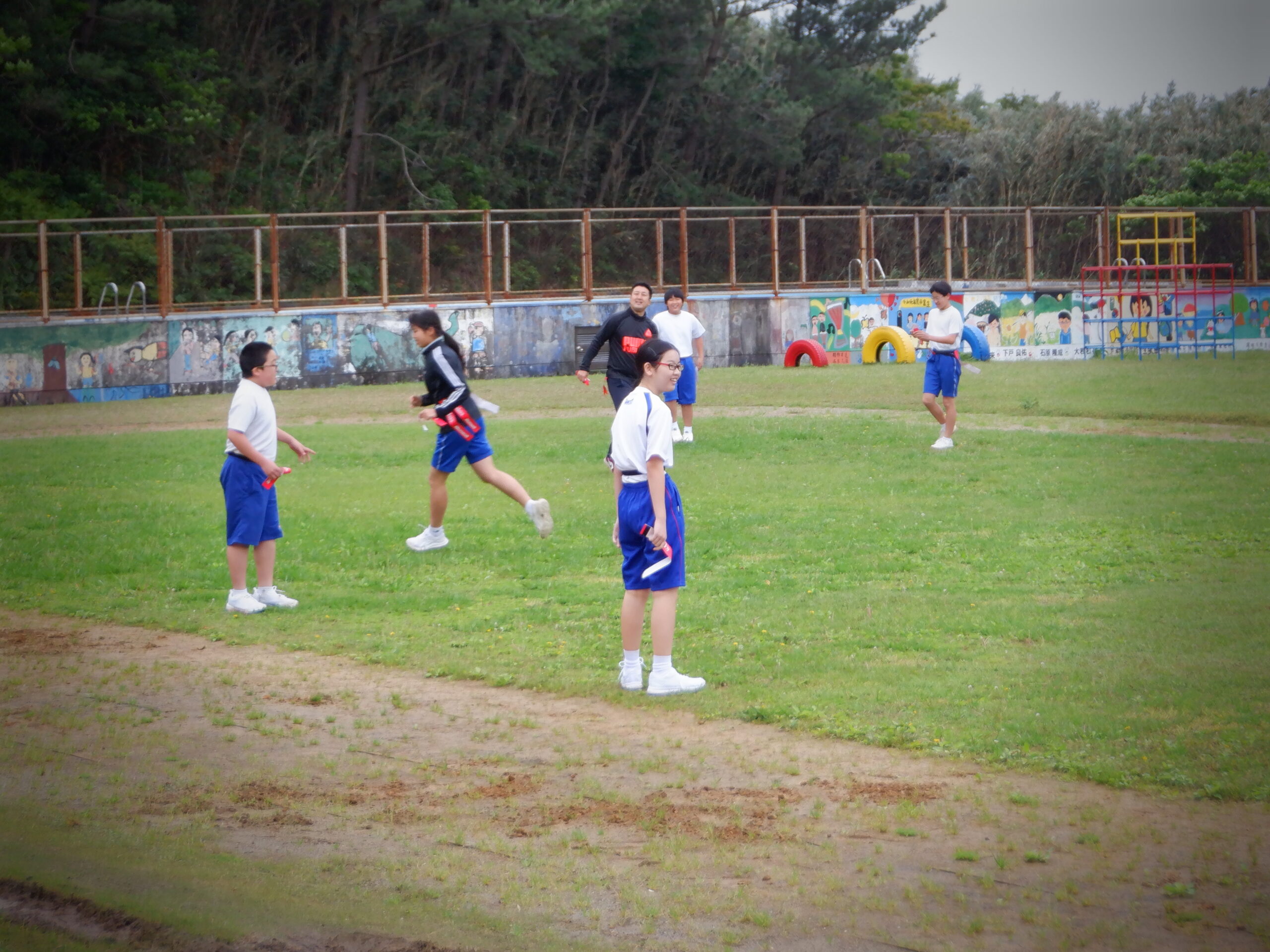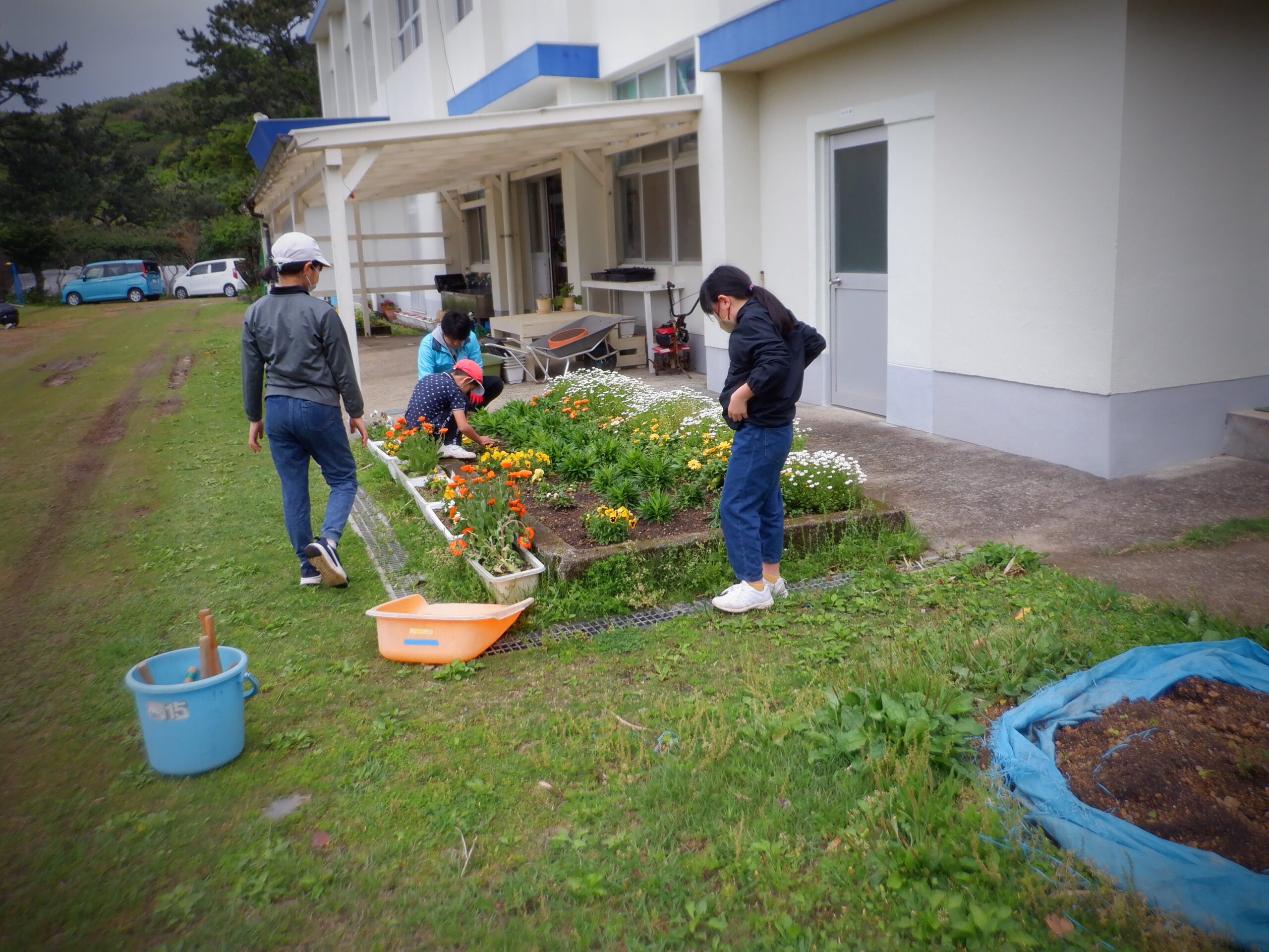 金曜日は、朝八時からフラワータイムです。 みんな一生懸命、花壇の草とりをしました。 フラワータイム終了後、後期課程生は朝の会。 2時間目は後期課程生は内科検診の後、みんなでシッポ取りゲーム。 片泊学園の校庭を思い切り走っていました。