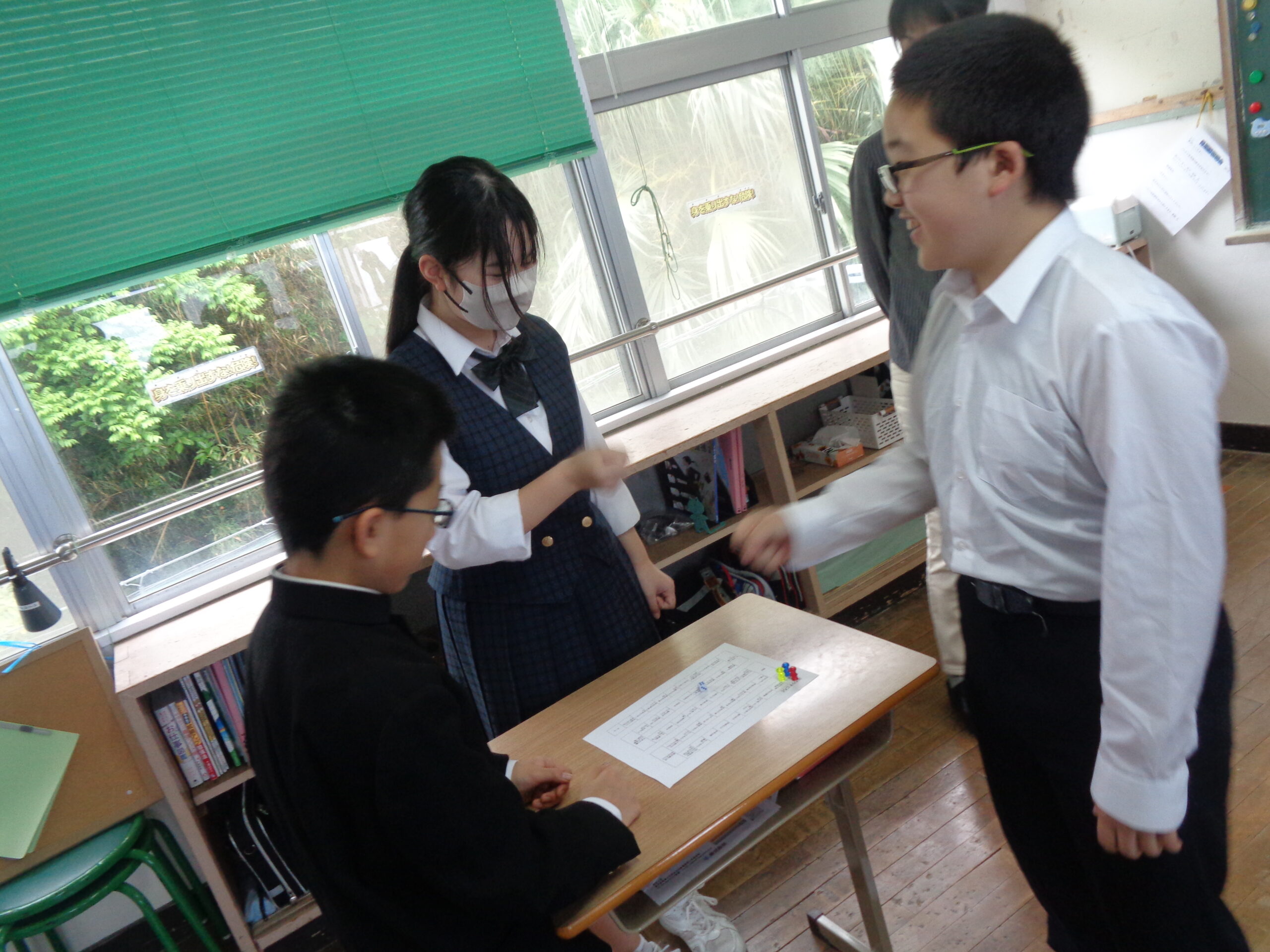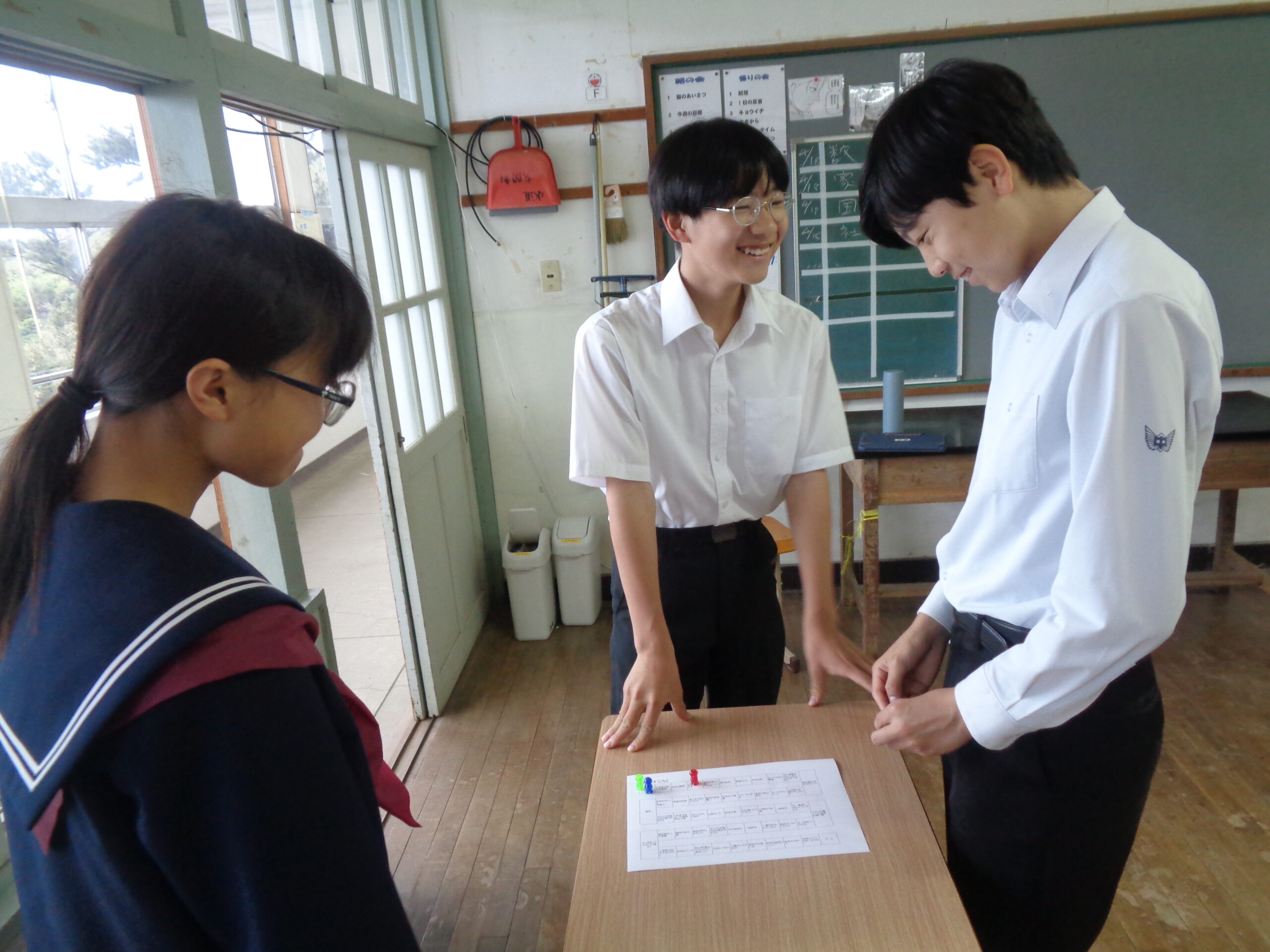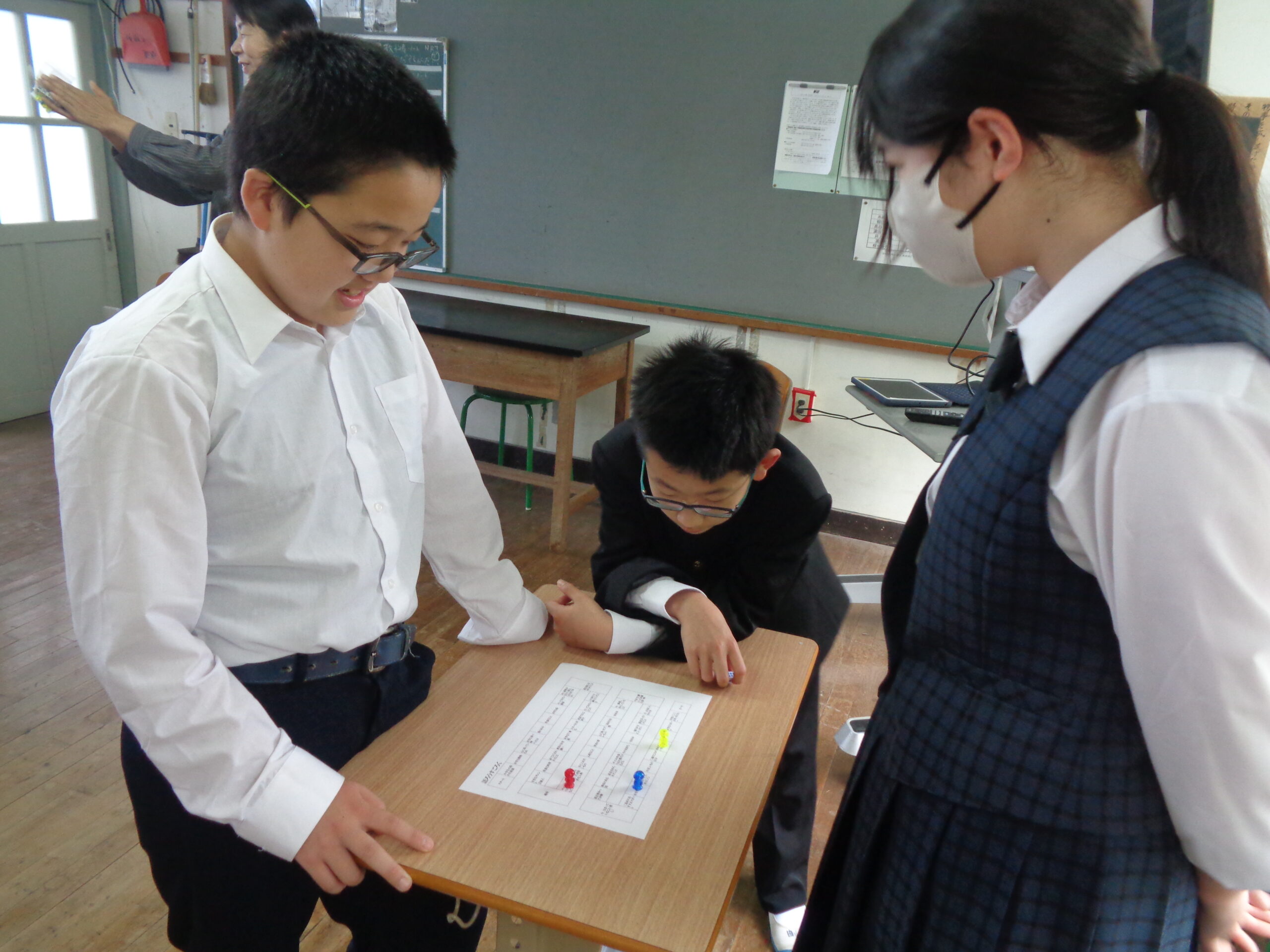 グループになって,すごろくのマスにとまった質問に答えていくゲームです。転入生もいたので,改めて友達のことを知る機会になったようでした。