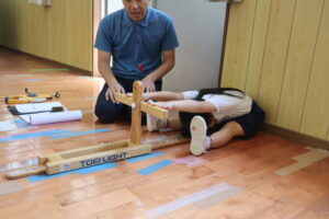 まずは集会室で,立ち幅跳びや握力などを測定しました。