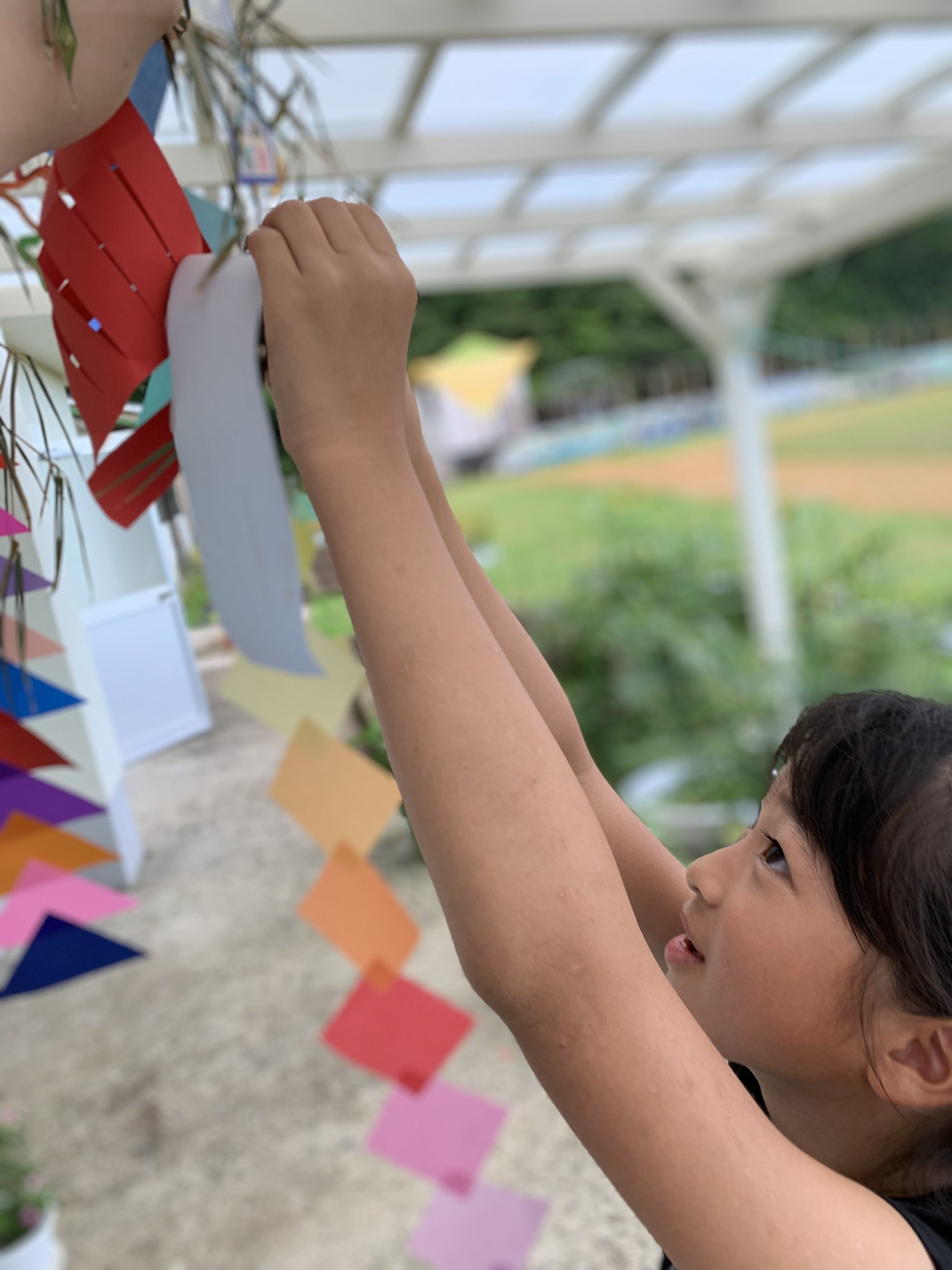 みかんです。🍊 今日は、前期生で、図工をしました。 鈴蘭テープを使って紐をつないでの学習をしました。